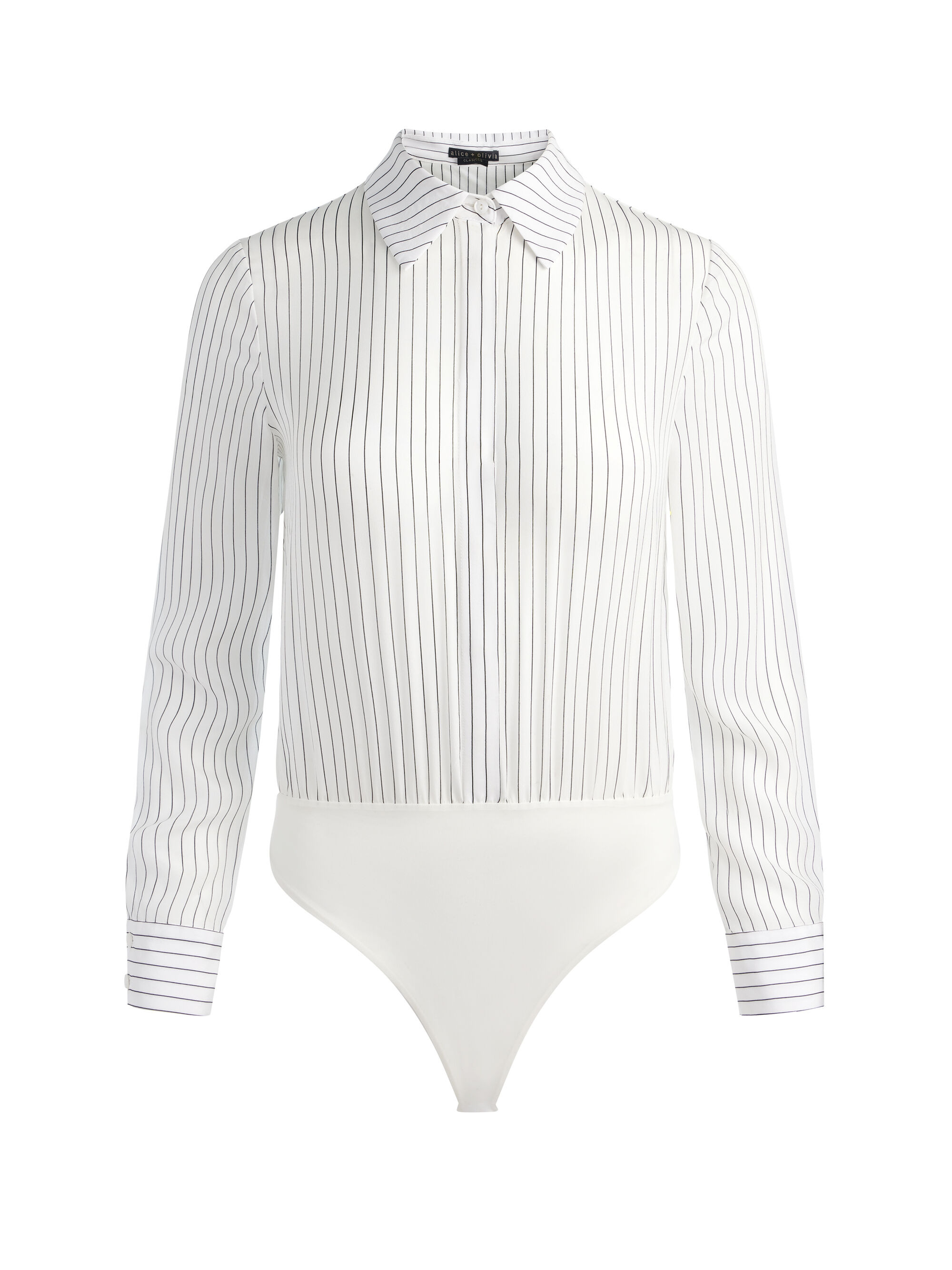 Your favorite button down turned bodysuit is back! Cut in 100% silk, it has everything you love about the Willa - a neat collar, hidden placket, and semi-sheer body - but now with a bodysuit design so you never have to worry about achieving the perfect tuck. A thong bottom with snap closures ensures minimal underwear lines and easy on-off convenience. This pinstriped blouse bodysuit is a true closet must have! DETAILS - Blouse bodysuit - Silk crepe de chine - Button down with hidden placket - Long sleeve - Collared - Thong back with snap closures - 100% silk - Dry clean only - Imported FIT - Model is 5'10" and wearing a size XS - Length from the shoulder: 20" - Fits true to size, take your normal size