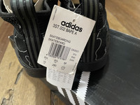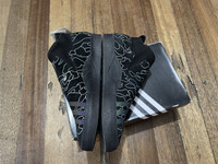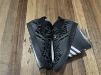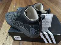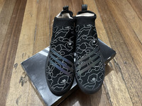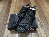 The Bape adidas 3ST.002 has an upper built with a mixture of suede and synthetic materials, providing durability and flexibility. The shoe features a sock-like construction with a bootie-like fit, offering a snug and comfortable fit. In addition, the shoe features a toe cap and heel panel, providing added protection and durability. The sneaker also features adidas' Boost technology in the midsole, offering cushioning and energy return to support impact absorption. The sneaker also incorporates adidas' Geoflex outsole, which provides grip and traction. The shoe has a pull strap on the heel for an adjustable fit. The adidas 3-Stripe branding is displayed across the sides. Brandnew Condition with original box