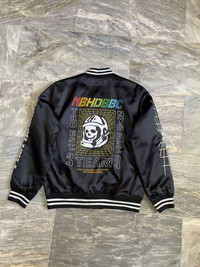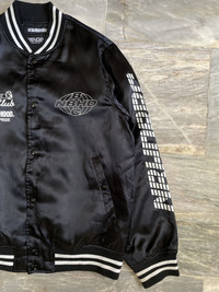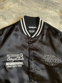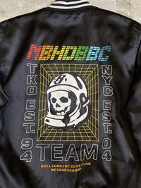 NEIGHBORHOOD and Pharrell Williams‘ Billionaire Boys Club have teamed up to celebrate their London, New York and Toyko footprints in a branding-heavy capsule collection. The capsule collection is comprised of a London-exclusive varsity jacket featuring a heavily-brushed melton body and leather sleeves, as well as another varsity jacket, hoodie, and T-shirt. Pieces combine the bold design details synonymous with BBC’s playful aesthetic alongside NEIGHBORHOOD’s nuanced references to American workwear and tradition. Much like the duo’s HYPEFEST collaboration from 2018, jackets sport a rear emblem that combines the two’s monikers in one grid-locked design. Elsewhere on the jackets, you’ll find a skeleton head take on the BBC spaceman emblem, a NEIGHBORHOOD varsity-style patch, dual-branded embroidery and nods to the BBC stores’ opening years — ‘94 for New York and ‘04 for Tokyo. Another varsity jacket sports printed dual-branding alongside a digital globe graphic and a web-like print on the sleeves. very good used condition flaws - small paint chip (check photo) Actual Measurements (inches) Chest (pit to pit): 22.5 Length: 27 Shoulder:18 Sleeve: 24.5 Message before buying. Items are pre-loved / second hand used. Manage your expectations. Buy with confidence. No return no exchange. Shipping from Asia Shipping time: 1-3 Days after bought Courier: DHL ETA:3-7 DAYS