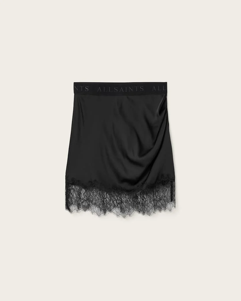 Azar Lace Trim Satin Mini Skirt Cut to an iconic mini shape, the Azar Skirt features all the hallmarks of gothic edge. With timeless lace trims and pin tuck detail, the regular fit shape is finished with an elasticated waistband for ease of wear. Pair with our leather knee high boots. - Pull on - Scalloped lace hem - Pin tuck detail at side seam - Branded elastic waistband - Measurements (from CB to hem): 43.5cm - Model is 5'9.5" and wearing size US 4 FABRIC & CARE: - Shell: 96% recycled polyester, 4% elastane - Trims: 100% polyamide - Mild machine wash at 30 Made in: China Product ID: USW118RE-5
