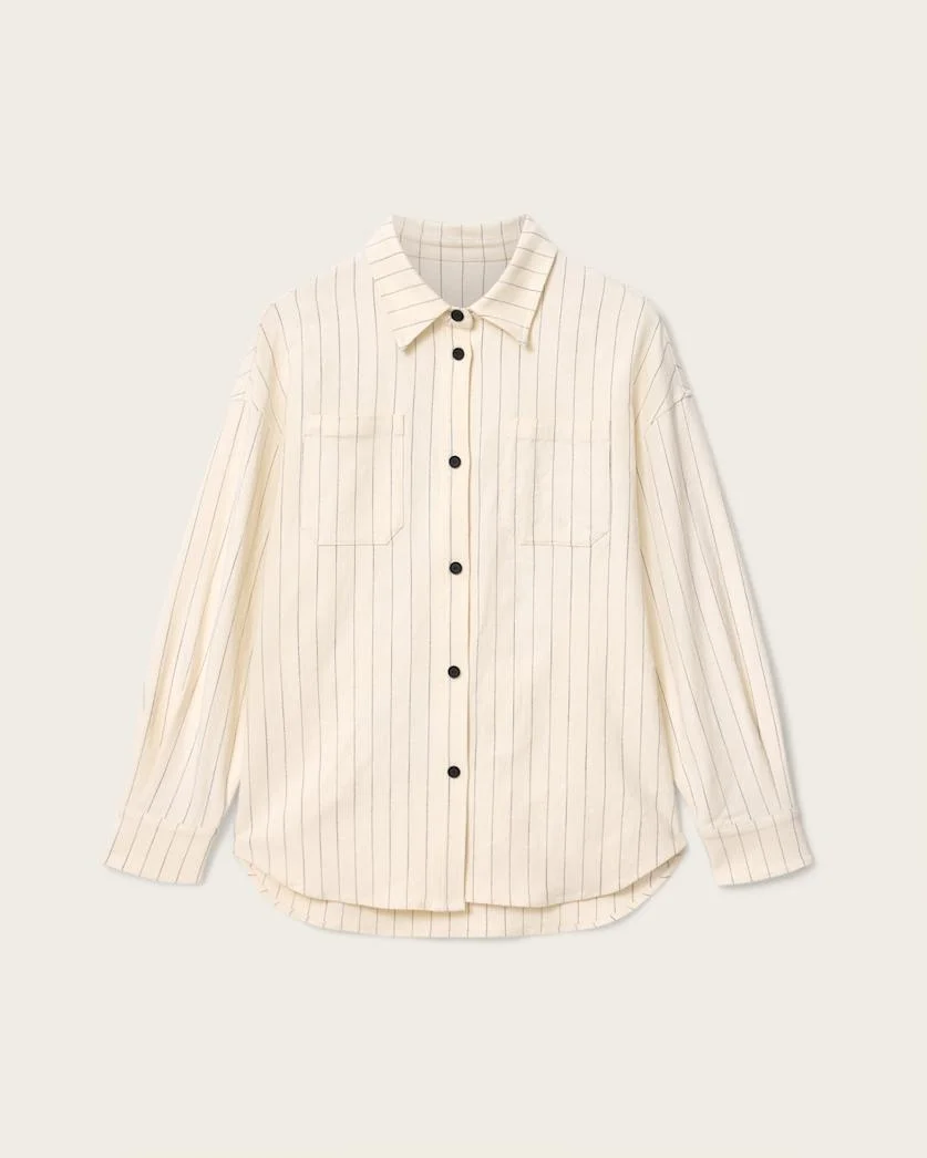 Olga Relaxed Fit Long Sleeve Shirt Cut to a relaxed shape and finished with that signature AllSaints character, the Olga is a shirt made for versatility. Featuring long sleeves, button closure and subtle stripes, pair with the matching pants for an eye-catching finish or our denim jeans for a more casual look. - Branded button closure - Collar - Long sleeves - Front patch pockets - Curved hem - AllSaints printed graphic - Model is 5'10" and wearing size US 4 FABRIC & CARE: - Shell: 88% viscose, 11% polyester, 1% elastane - Dry clean only Made in: China Product ID: USW107PE-4742