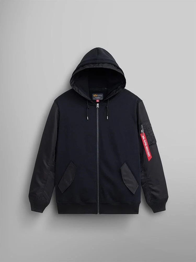 For lighter transitional days, this black MA-1 zip-up hoodie in french terry fabric is the perfect choice. It includes flight nylon sleeves and detailing for that classic bomber silhouette. FEATURES - Weight: 440 g - Flight nylon sleeves - Double layer hood with zig zag stitch placket - Two front flap pockets with snap closure - MA-1 utility pocket