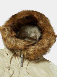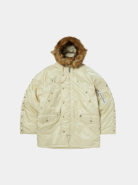 The THUG CLUB X ALPHA N-3B PARKA features a classic N-3B Parka body with a relaxed fit, and a strip of detachable metal studs down each side seam. BENEFITS - Water resistant FEATURES - Faux fur-lined hood - Velcro detailing - Heavy polyester fill for insulation - Two Alpha X TC hangtags - Handmade rivets