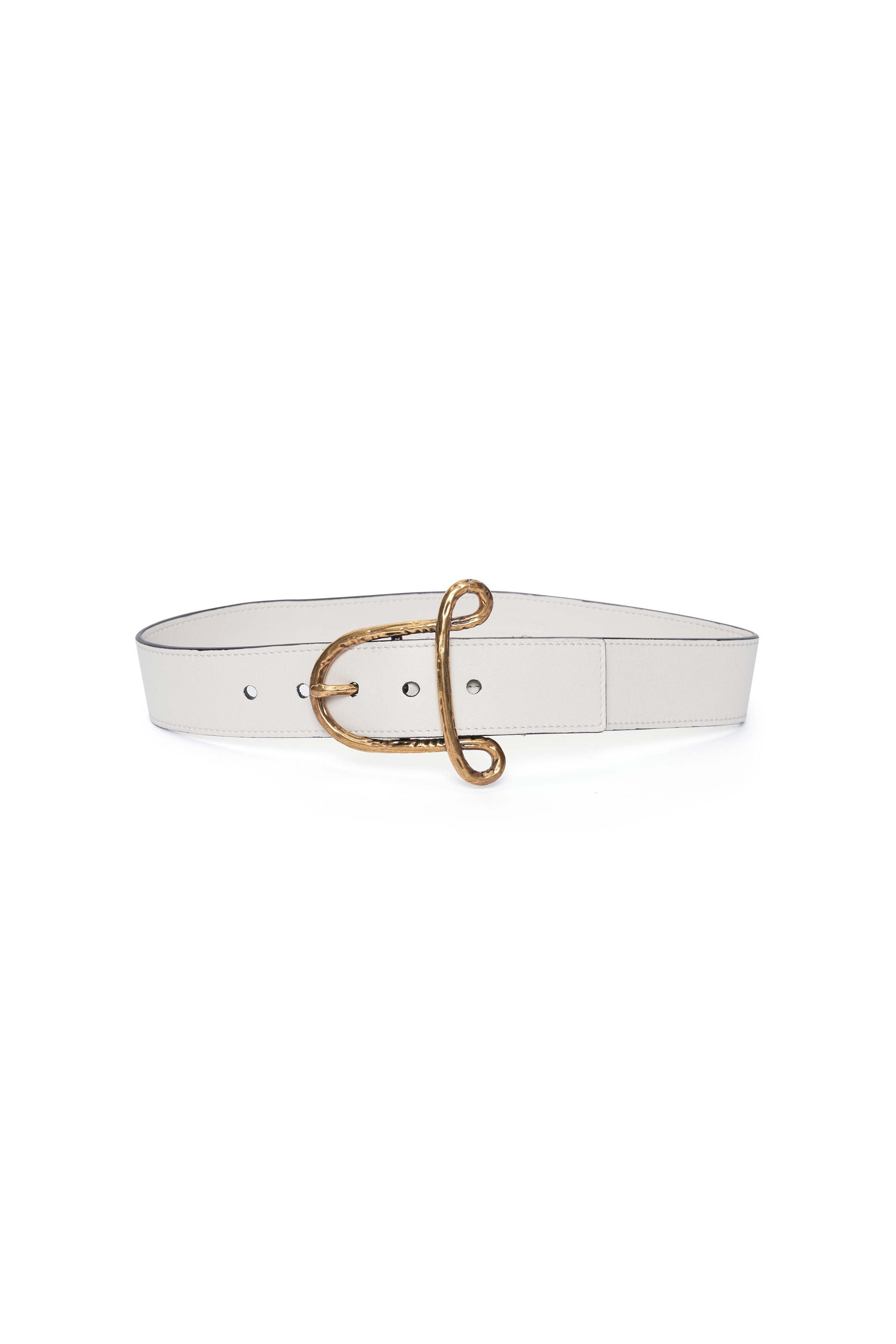 The A Belt is crafted in smooth ivory leather with tonal topstitching. Features an abstract A-shaped buckle in textured gold-tone metal at the center-front. Details Gold-tone metal hardware Pin buckle closure 100% Calf Leather Total length: 32 inches / 81cm Width: 1.5 inches / 4cm