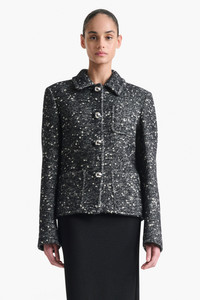 The Bart Jacket is crafted from textured tweed in a black-and-ivory herringbone pattern with subtle flecking throughout. Designed with a pointed collar, button-front closure, and patch pockets, it blends classic tailoring with a modern, relaxed silhouette. Details 60% Virgin wool, 16% Polyamide, 12% Mohair wool, 12% Alpaca wool. Made in Italy