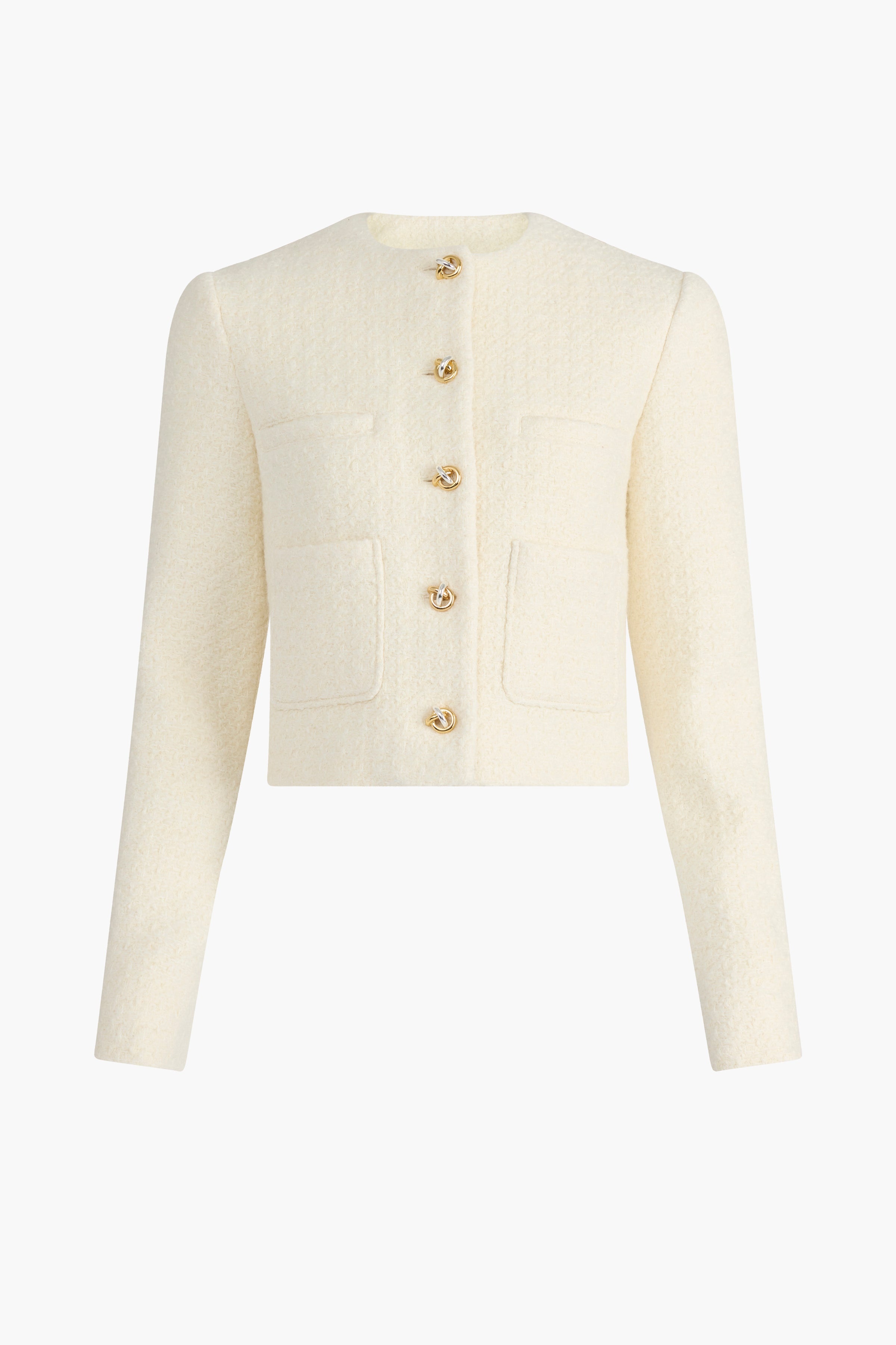 The Beanie jacket is the definition of chic day-to-night dressing. The boucle jacket is detailed with two-tone metal knot buttons, inspired by heirloom jewelry. Details '-39% Polycotton, 37% Wool, 20% Polyester, 4% Acrylic fiber. Made in Italy