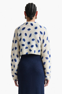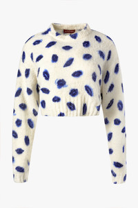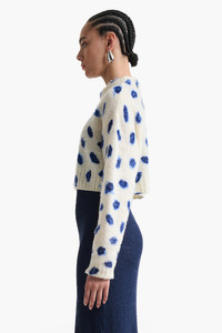 The Biddie sweater is woven from a luxurious extra fine merino blend with a super soft handle. Note the blue smudged kisses printed throughout which resemble marks left on a napkin. Details '-85% Extrafine Merino Wool 15% Recycled Polyamide -Imported