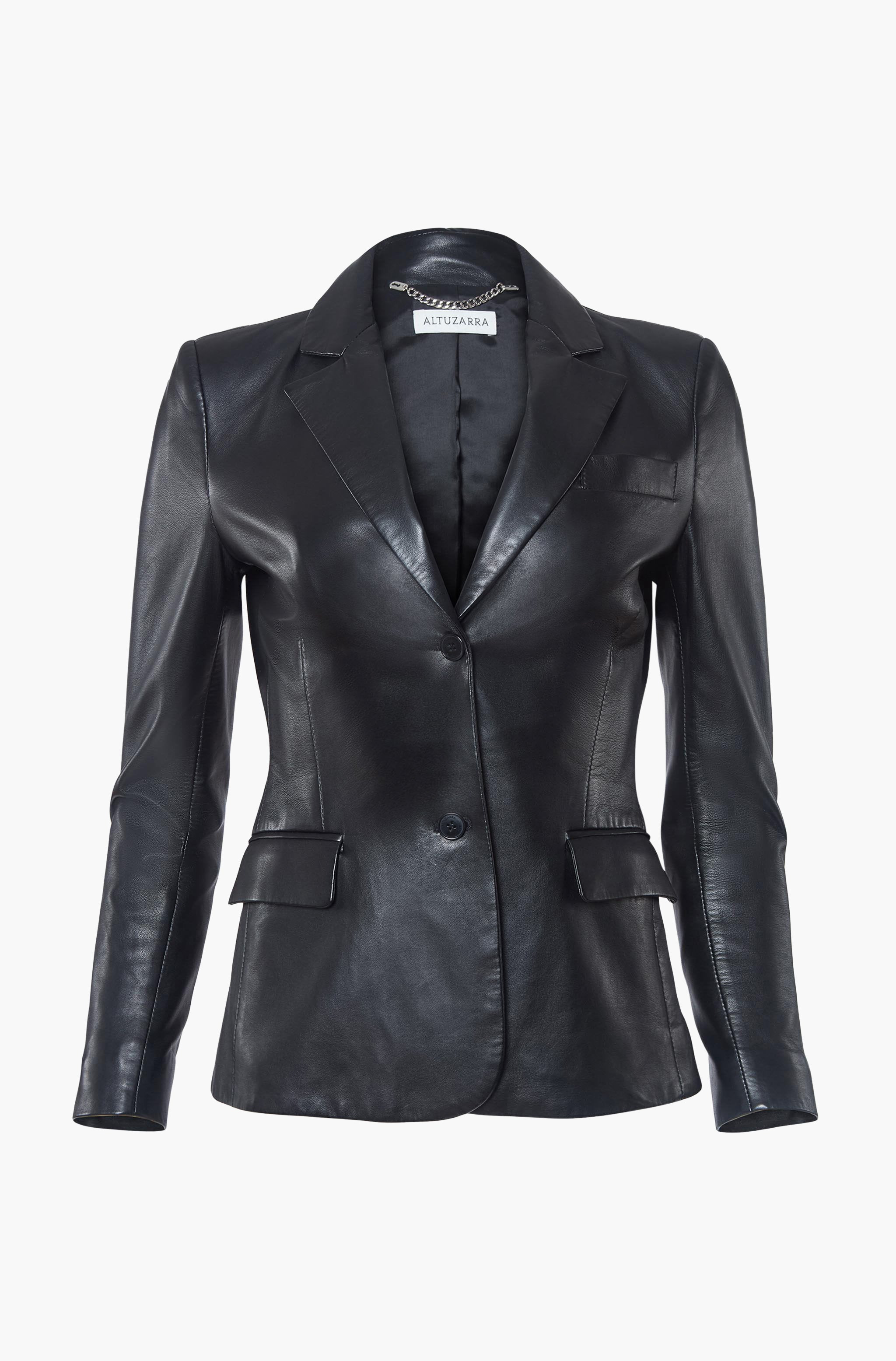 The Fenice Leather Jacket is part of the Core Collection. Crafted to a signature Altuzarra silhouette with structured shoulders and a neatly tailored waist. It has high notched lapels, a single chest pocket and flap front pockets. Details Structured shoulders and a tailored waist High notched lapels for added elegance Single chest pocket and flap front pockets for style and functionality 100% Lamb leather - premium quality leather for durability, comfort and a luxurious feel Versatile and timeless design for any occasion Made in Turkey Model is 5'10" and is wearing a size 36