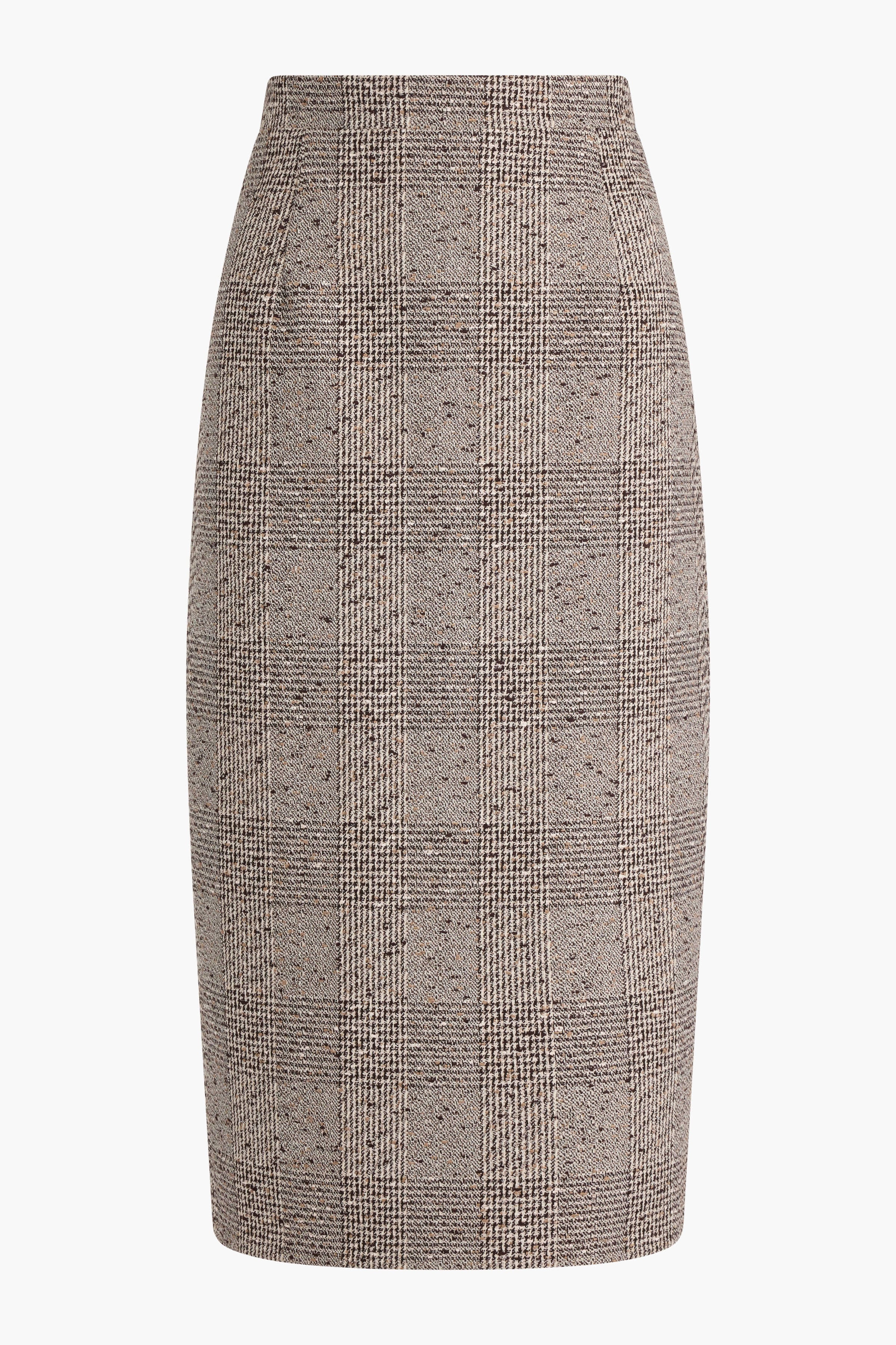 The Hank skirt epitomizes chic on-duty dressing. It's woven from a virgin wool blend to a close-fitting midi silhouette in a brown plaid. Complete the look with a tucked in white shirt and heels. Details 70% Virgin wool, 21% Viscose, 9% Polyamide. Made in Italy
