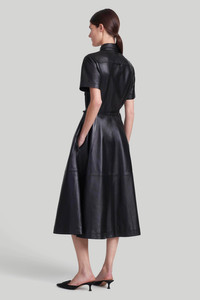 The Kiera Dress is cut from soft lambskin leather to a classic A-line silhouette with a small point collar and short sleeves. Its detailed with a slim buckled waist belt. Details Point collar Short sleeves Button detailing Slim leather waist belt with buckle fastening Mid length 100% Lamb Leather Made in Turkey Model is 5'10" and is wearing a size 36