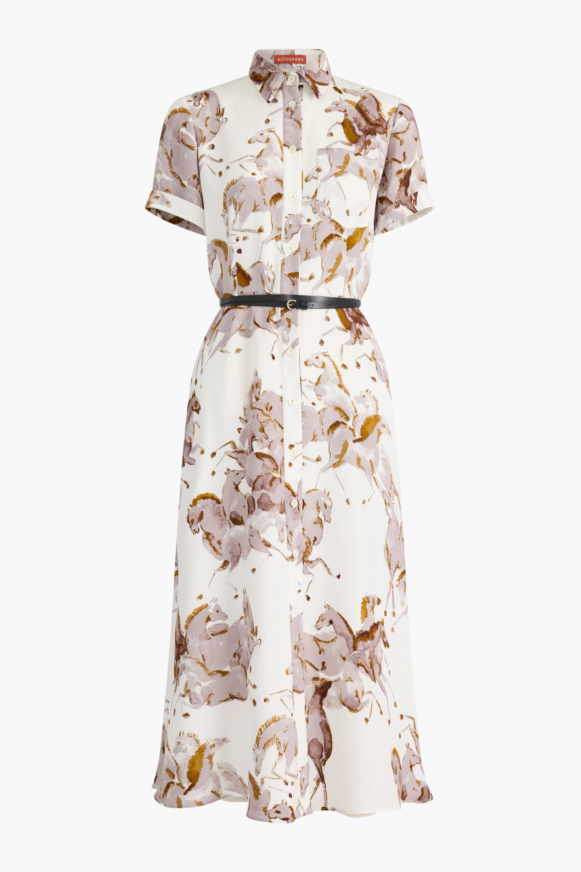 The Kiera dress features an airy A-line silhouette. Designed with a small point collar and short sleeves, it's detailed with a slim leather waist belt. Details 100% Silk. Made in Italy
