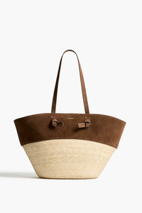 The large Knot basket bag is the ultimate transitional accessory. It's made in Spain with a woven raffia base which is contrasted by a leather top panel. Note the shoulder straps finished with knotted ends. Details 90% Palm 10% Calf Leather. Made in Spain