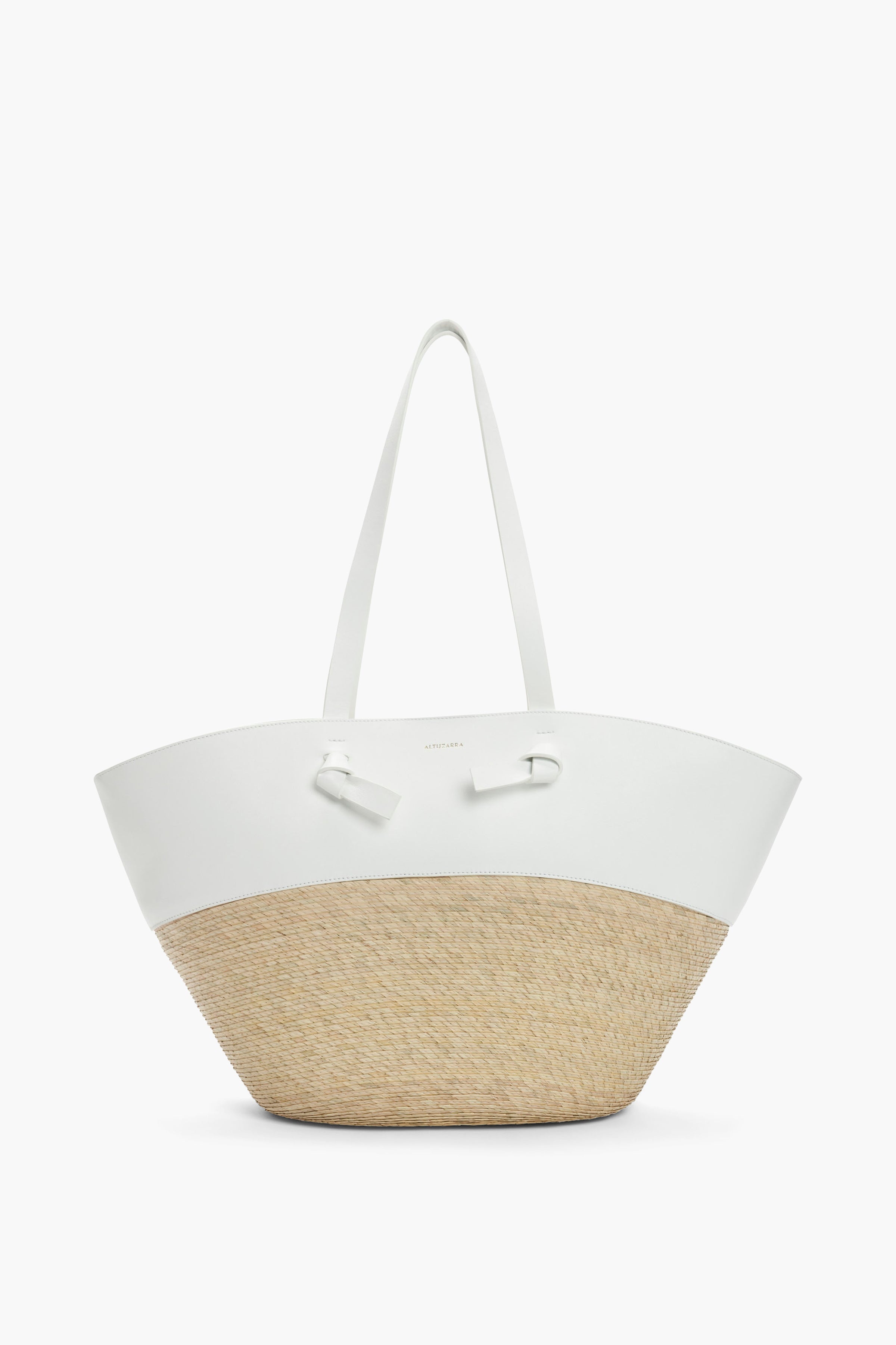 The large Knot basket bag is the ultimate transitional accessory. It's made in Spain with a woven raffia base which is contrasted by a white leather top panel. Note the shoulder straps finished with knotted ends. Details 90% Polyamide, 10% Calf Leather Made in Spain