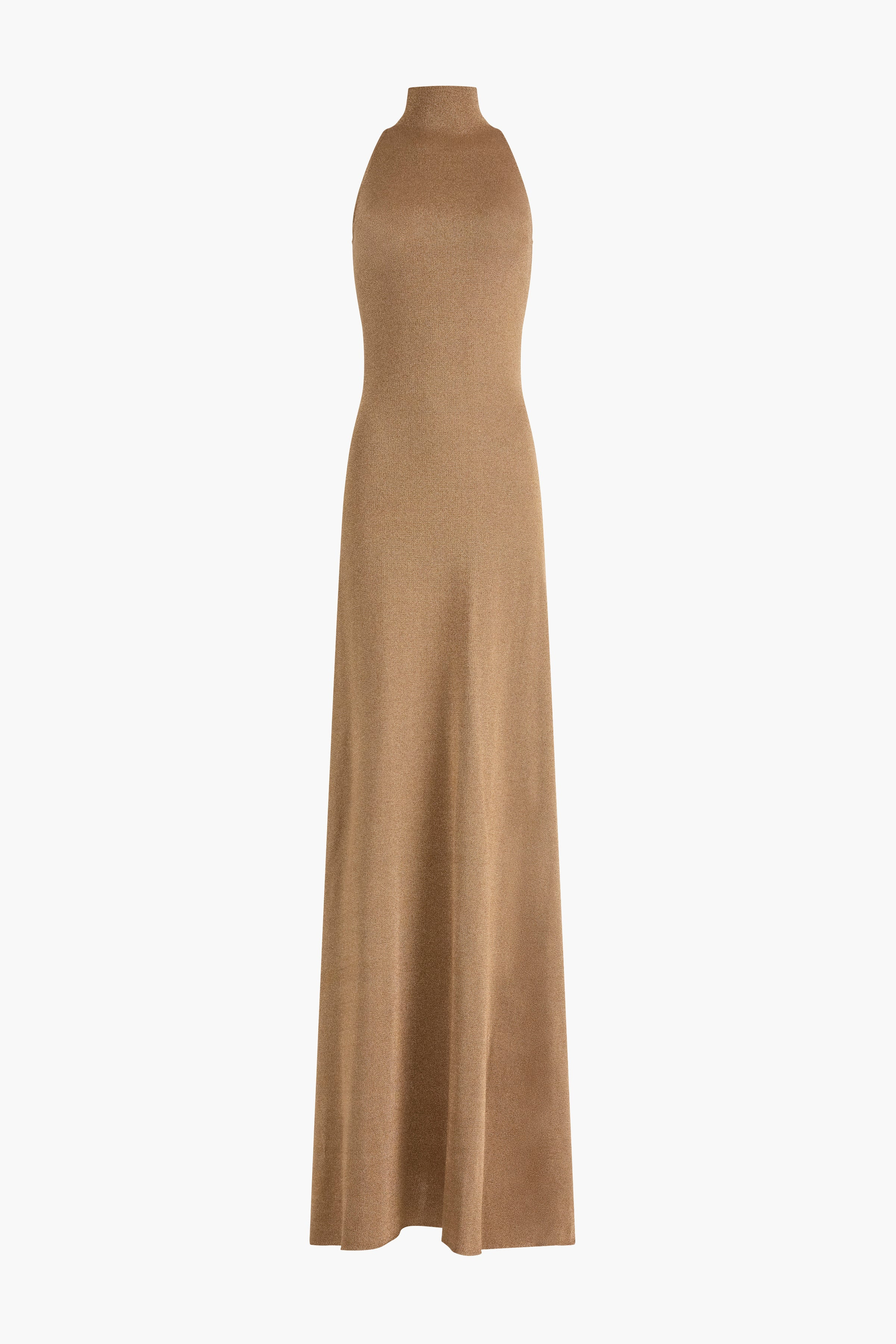 The Mitzi Dress has a dramatic maxi silhouette with a turtle neck. It's beautifully shaped to a close-fitting silhouette from viscose jersey that has a metallized fibre running through for a subtle sheen. Details 79% Viscose, 17% Metallic Fiber, 4% Polyester