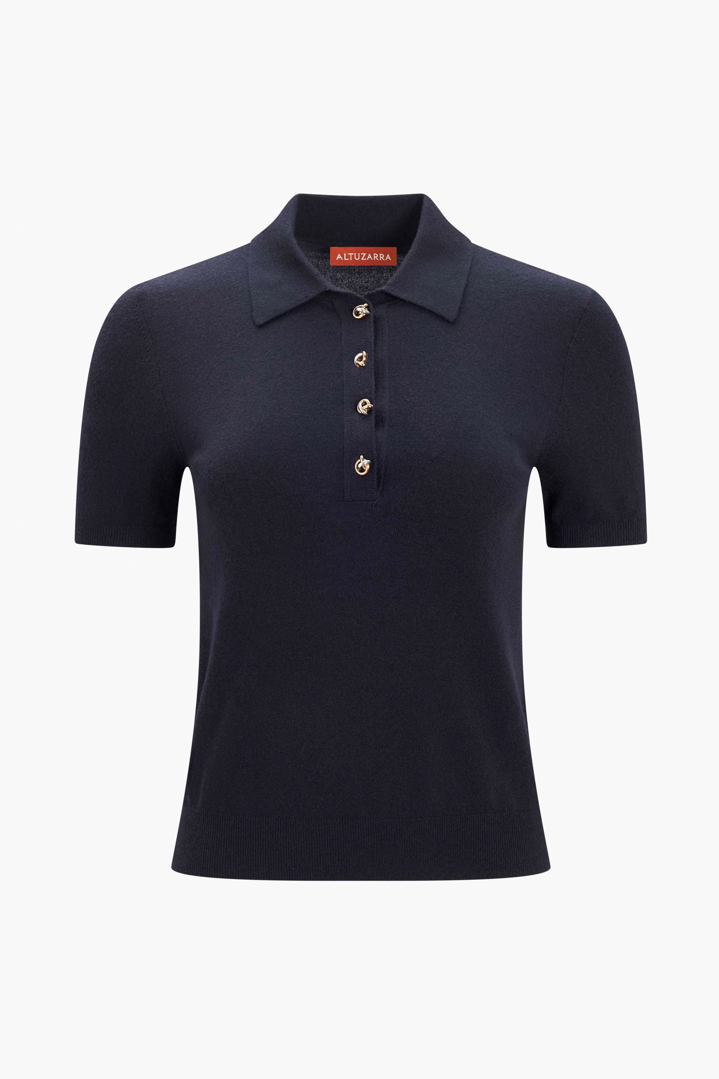 The Nemo top is the definition of chic day dressing. The polo style is knitted from a superfine merino blend then detailed with two-tone metal knot buttons. Details Short sleeves Polo collar Ribbed hem and cuffs Fitted silhouette 88% Merino Wool, 8%Polyamide, 6%Polyester, 1%Elastane