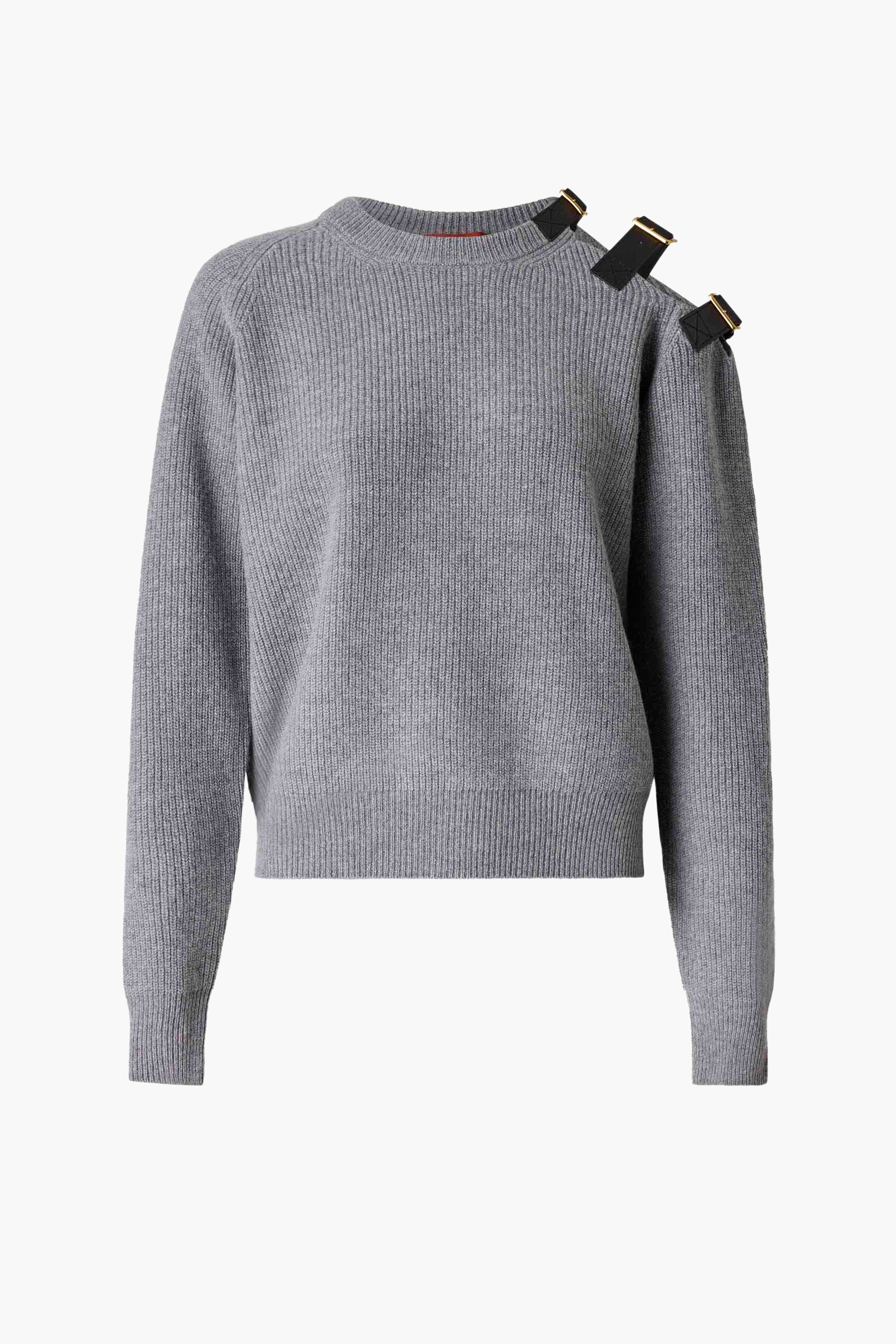 The Ness sweater is ribbed-knit from an irresistible blend of merino wool and cashmere in a slightly oversized silhouette. In stark contrast to its softness, a row of metal buckle straps adorn the garments cold shoulder. Details 90% Ultrafine Merino Wool, 10% Cashmere