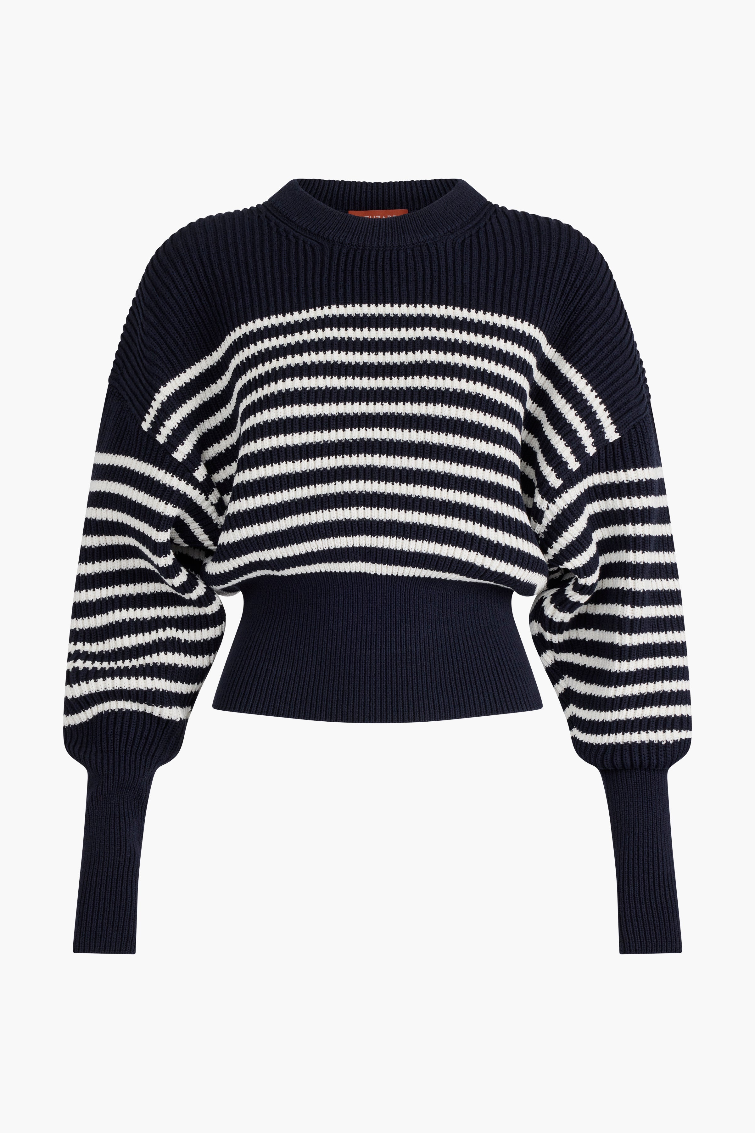 The Tanessa sweater draws inspiration from maritime designs, knitted from navy cotton with contrasting white stripes. It features extended cuffs and hemline creating a voluminous bodice and sleeves. Details 100% Cotton