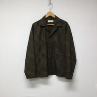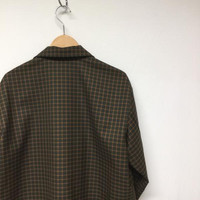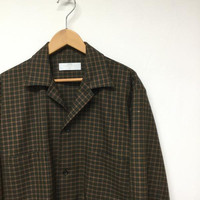 immaculate condition brown plaid shirt 50 wool 50 polyester beefy fabric, great quality shirt. the moment you handle the shirt, you know it's quality. measurements in pic (tagged size 3) made in japan length 68cm shoulder 50cm width 60cm sleeve 59cm 9%