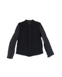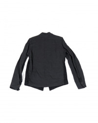 9% Black mixed materials, collarless shirt jacket. Front has light black pinstripes and a multi-button front. Back is a plain dark grey cotton. Tagged size 4 - fits like a slim L. Wool/cotton/bamboo blend. dry cleaned and has not been worn since incredible mixed media jacket/shirt, rare find in this style sleeves will get nice wrinkle patterns with use