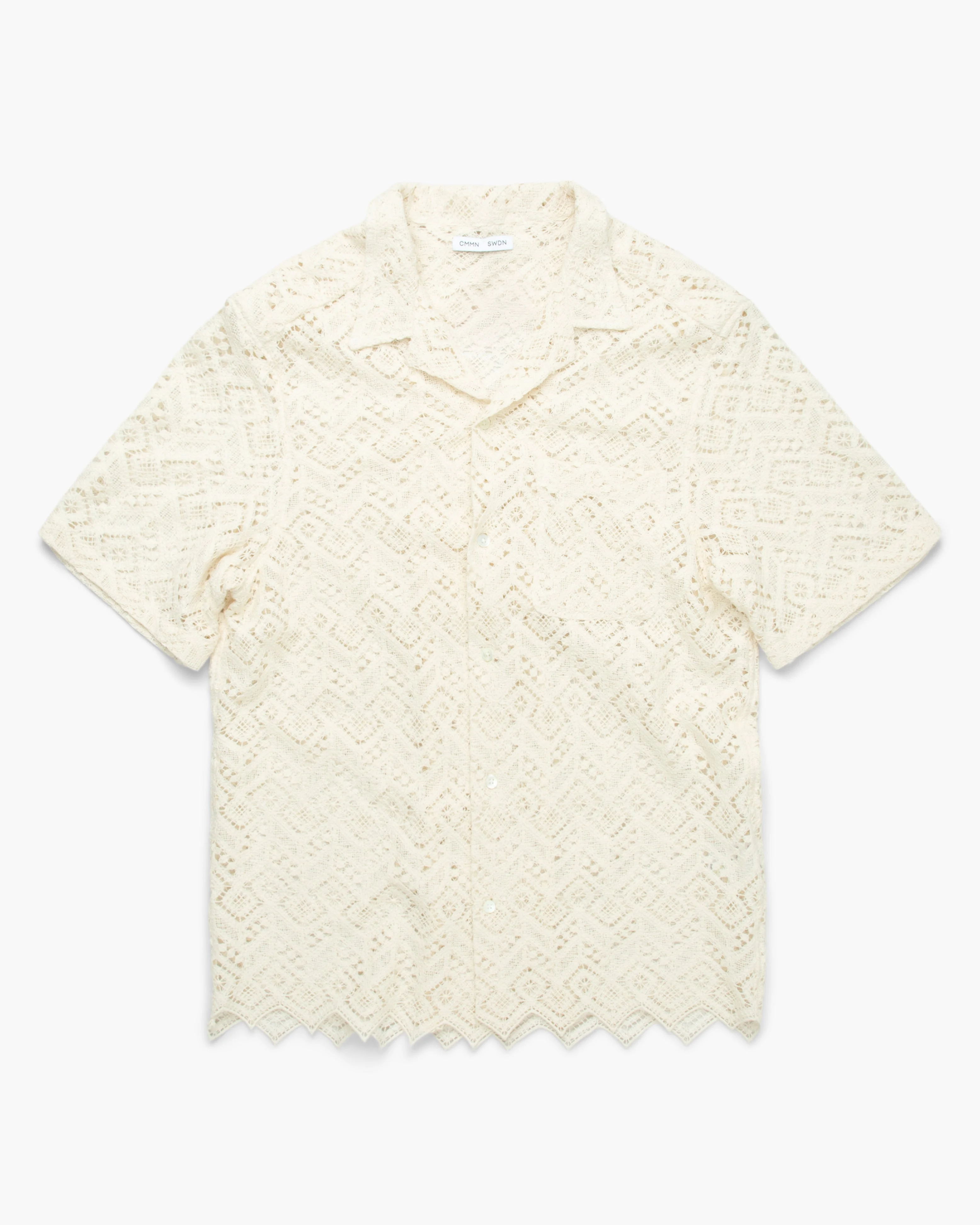 A cream-colored, Ture Cotton Lace Shirt by CMMN SWDN. Features a camp collar and short sleeves, along with a relaxed fit and intricate cotton lace fabric, complete with a rounded chest pocket and scalloped hem.