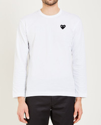 THE BLACK HEART LONG SLEEVE TEE IN BLACK OR WHITE BY COMME DES GARCONS PLAY IS A REGULAR FIT STYLE FEATURING A SMALL BLACK HEART EMBROIDERY. STORE ID: P1T120 100% COTTON MACHINE WASH MADE IN JAPAN MODEL IS WEARING SIZE: L MODEL MEASUREMENTS: 6'1, 175 LBS, 38" CHEST, 31" WAIST