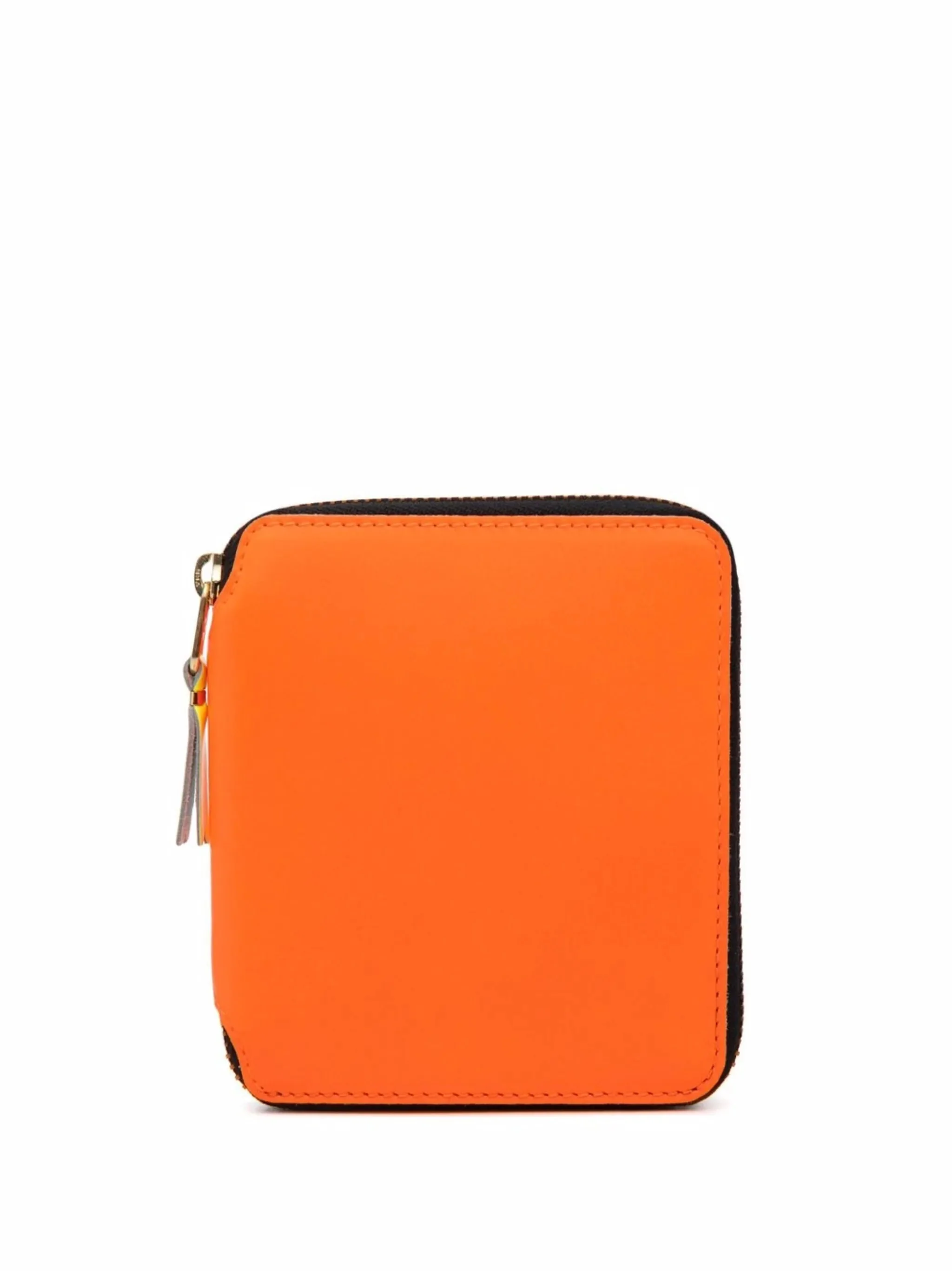 The Super Fluo 3 Side Zip Wallet from Comme Des Garcons is made of light orange goat skin leather with a square shape. It includes a full zip closure, card compartments, a coin pocket, and an internal logo stamp. Made in Spain, measuring 110mm by 85mm.
