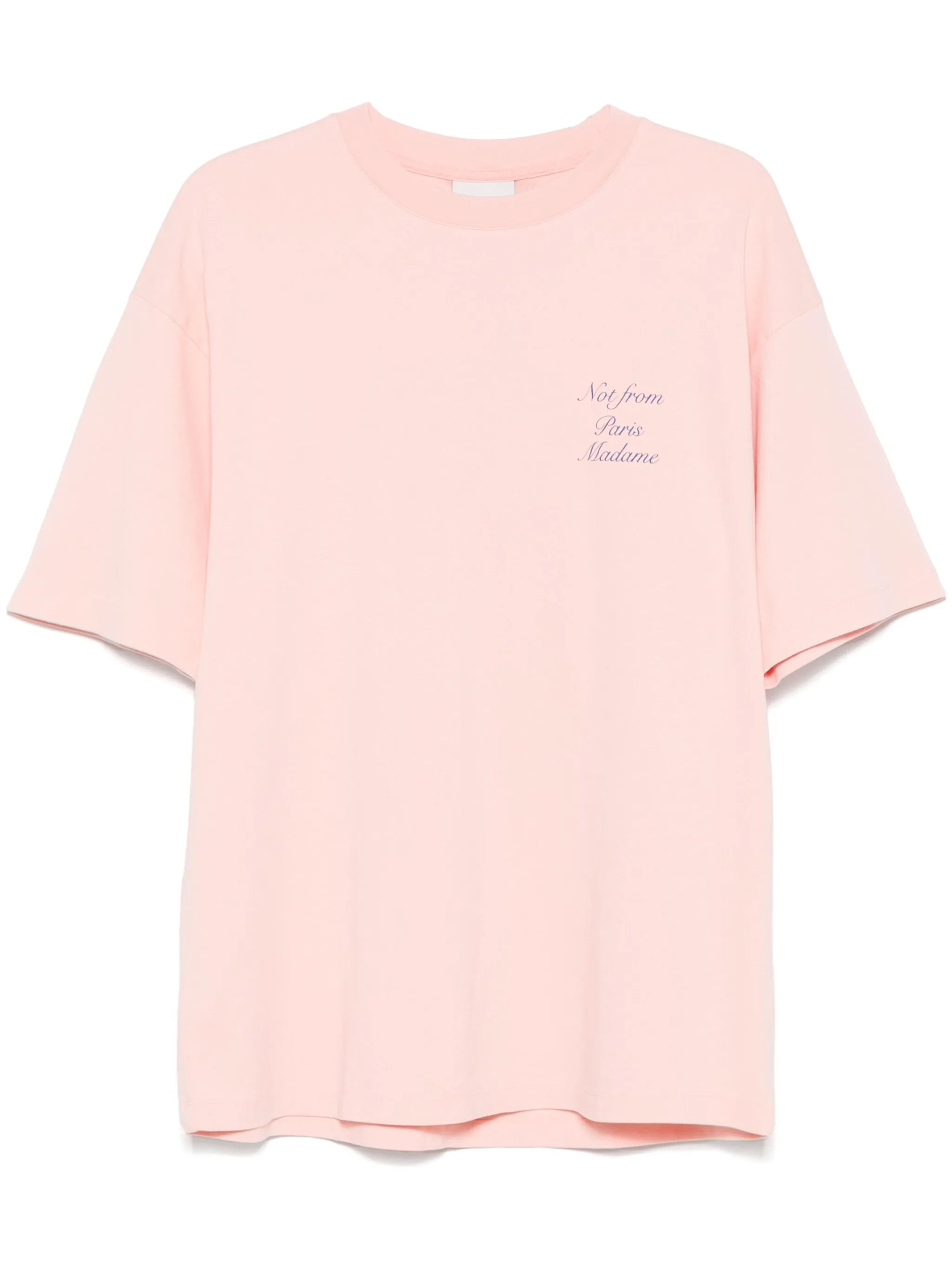 Le T-Shirt Slogan Cursive by Drole De Monsieur in pink features a bubblegum pink text print, crew neckline, and short sleeves. Made from 100% cotton.