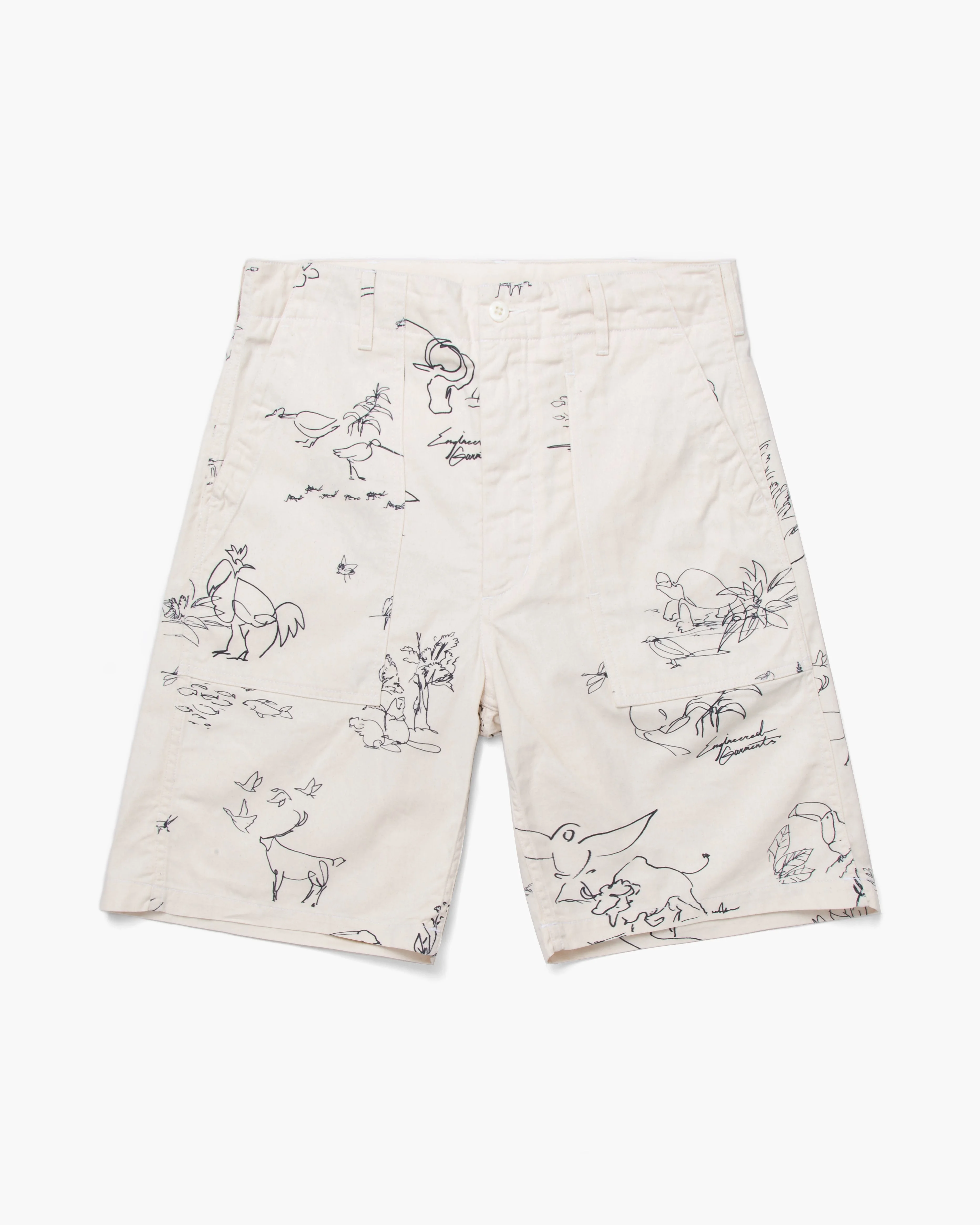 Engineered Garments' Fatigue Short in natural features printed tropical sketches throughout. Drawing inspiration from military fatigue pants, these shorts contain front and back flap patch pockets, and have a regular fit leg cut that stops just above the knees. Store ID: QT163 100% Cotton Wash Cold Made in the USA