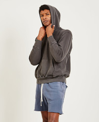 Cropped Hoodie in Vintage Black by Les Tien. A boxy and relaxed-fit pullover hoodie in an ultra-soft hand, just like a perfectly worn-in vintage hoodie. Store ID: CF 1001 VINT Model is wearing size: L Model is: 6'2" 100% Cotton Wash Cold Made in the USA