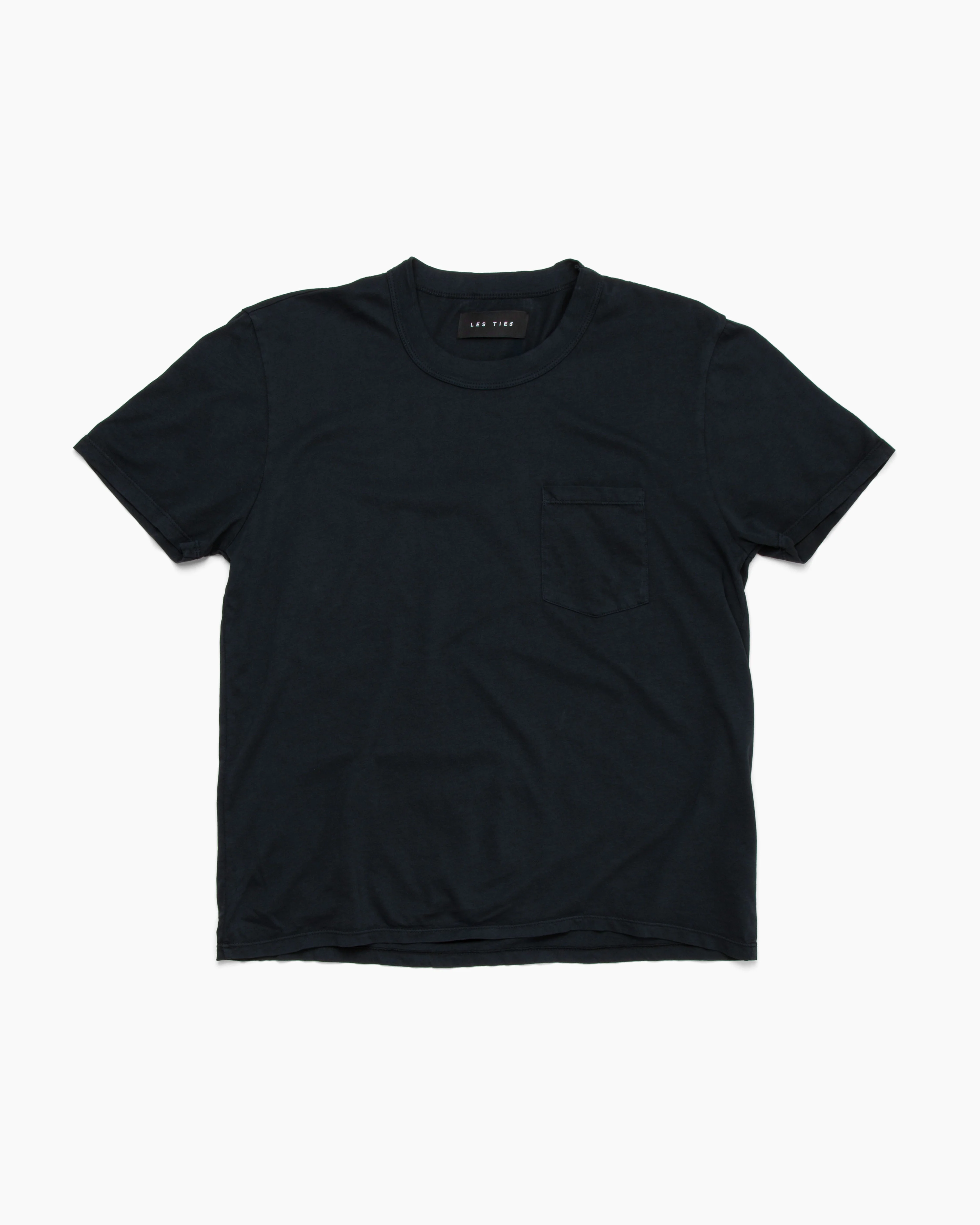 The Lightweight Classic Pocket Tee in faded black by Les Tien is made in the USA from 100% cotton. It features a garment-dyed finish, a crew neckline, and a patch pocket on the left chest. CJ-2089