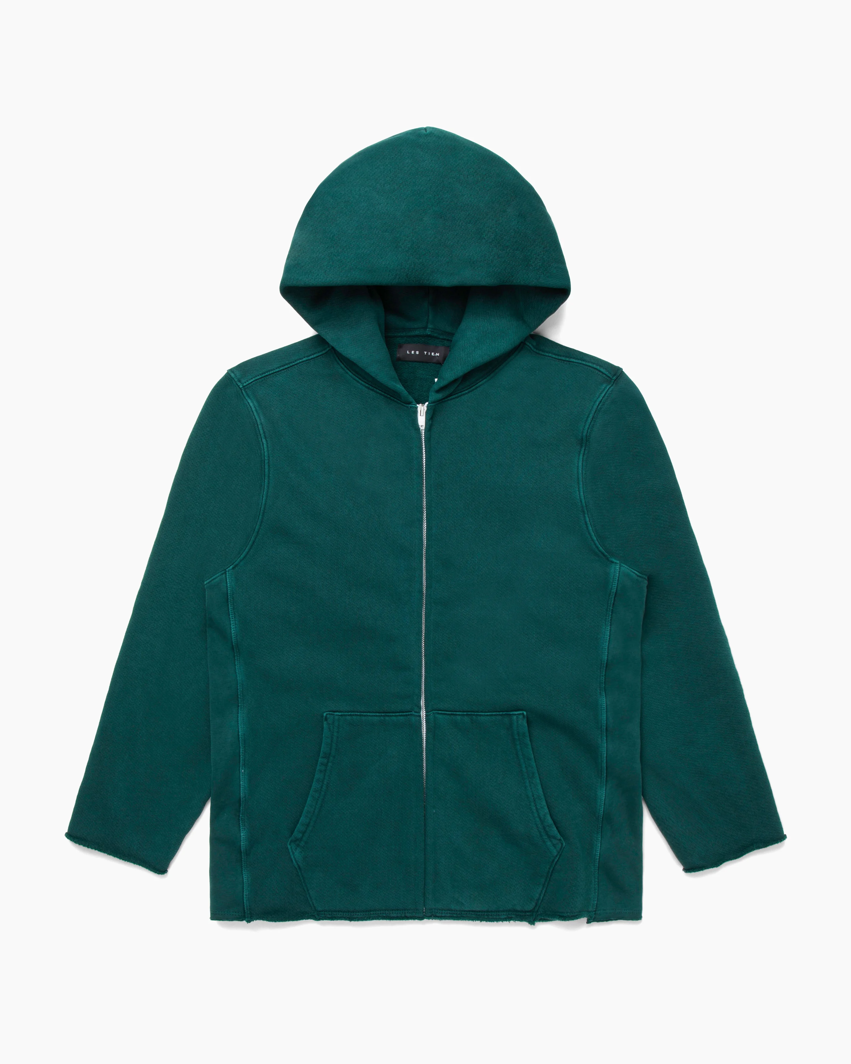 Les Tien's washed emerald green Raw Zip Hoodie features vintage brushed texture and is laundered, pre-shrunk, and garment dyed. With reverse outer stitching cuff details, gold plated Cobrax grommets, and a front Riri zipper closure, this hoodie also includes split front kangaroo pockets and a raw edge finish. Store ID: CF-1070-PD WEME Made in the USA