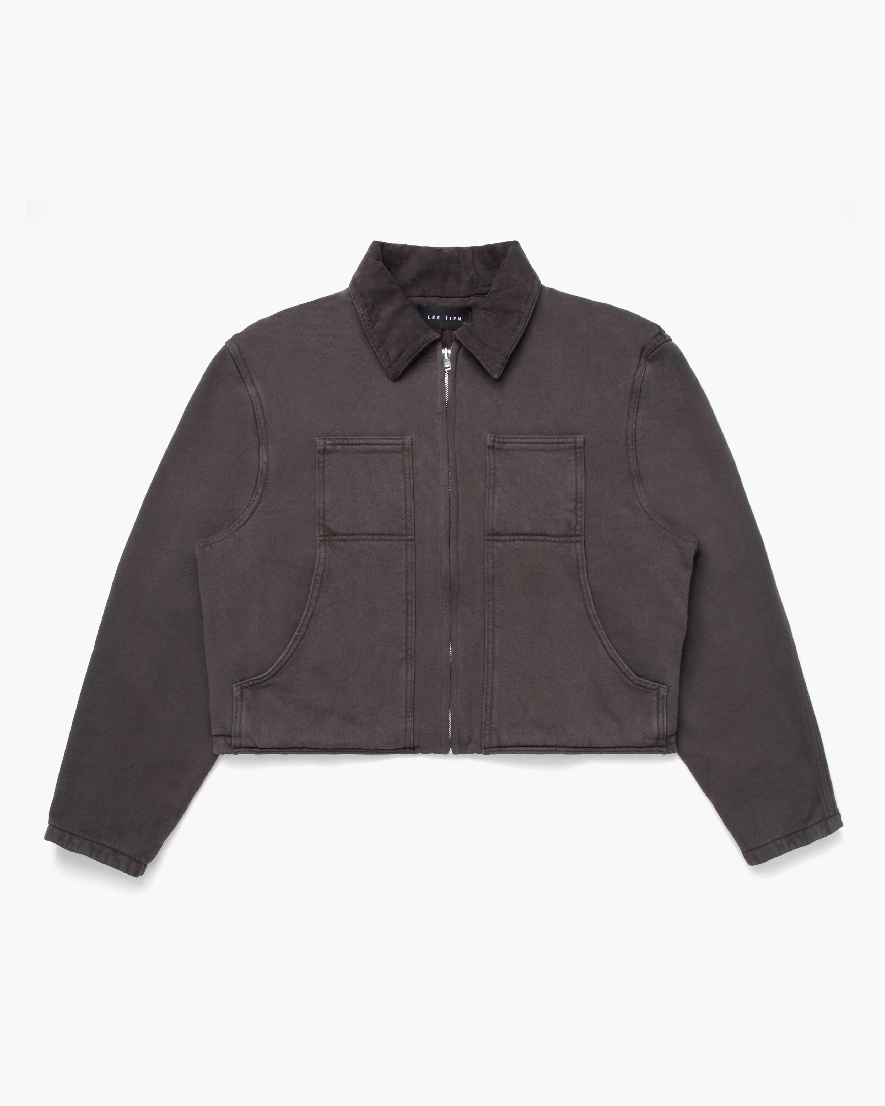 Les Tien's vintage black Utility Jacket has an oversized, boxy, and cropped fit in 13 oz 100% cotton dry structured fleece. Vintage brushed texture, laundered and pre-shrunk for a reverse outer stitching cuff details. Features Riri zipper front and patch pockets.