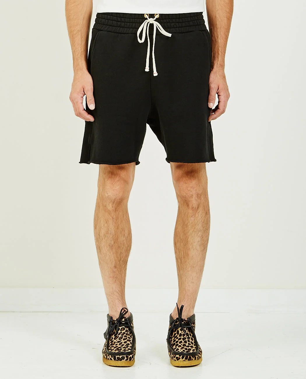 Yacht Short in jet black by Les Tien. Made of a super-soft cotton with a vintage feel. These shorts feature a wide elastic waist with drawstring, side pockets, a back patch pocket, and an unfinished hem. Store ID: CF 3000 JET Model is wearing size: L Model is: 6'1, 175lbs, 38" chest, 31" waist 100% Cotton Wash Cold Made in USA