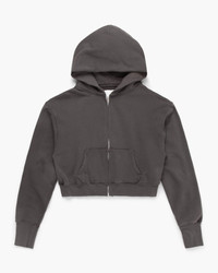 Zendaya Crop Zip Hoodie in vintage black by Les Tien. Structured 100% cotton fleece with a boxy, cropped silhouette that sits at or above the waistline. Features a Riri zipper, gold-plated Cobrax grommets, kangaroo pockets, and a deep hood. Made in USA.