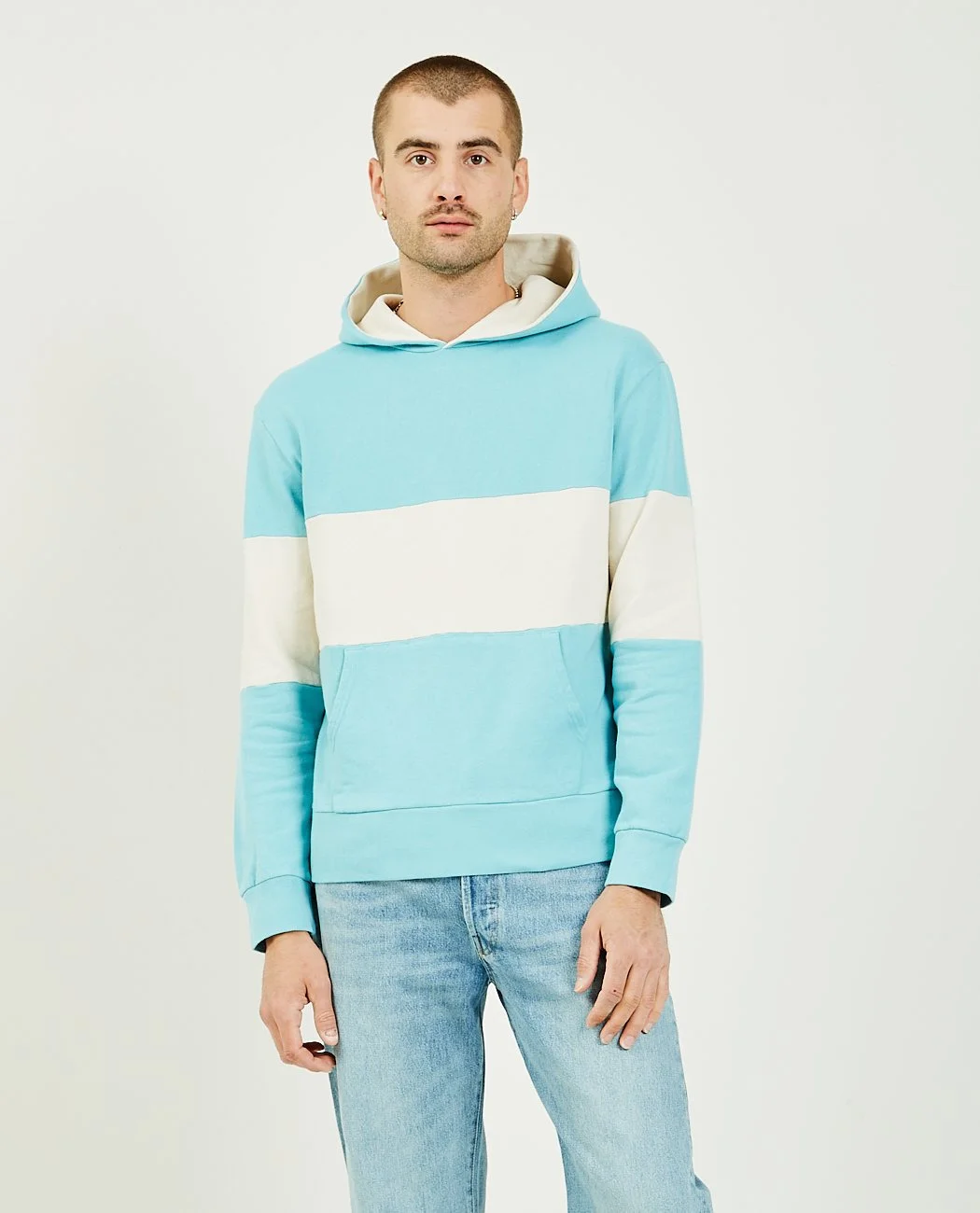 The 1970s Hoodie in blue and white by Levi's Vintage Clothing. A classic 1970s hoodie faithfully reproduced stitch for stitch. Features a regular fit, color-blocked detail, dropped shoulder, and a retro color blue. Store ID: C-84525-0000 Model is wearing size: L Model is: 6'1, 175lbs, 38" chest, 31" waist 100% Cotton Wash Cold Imported