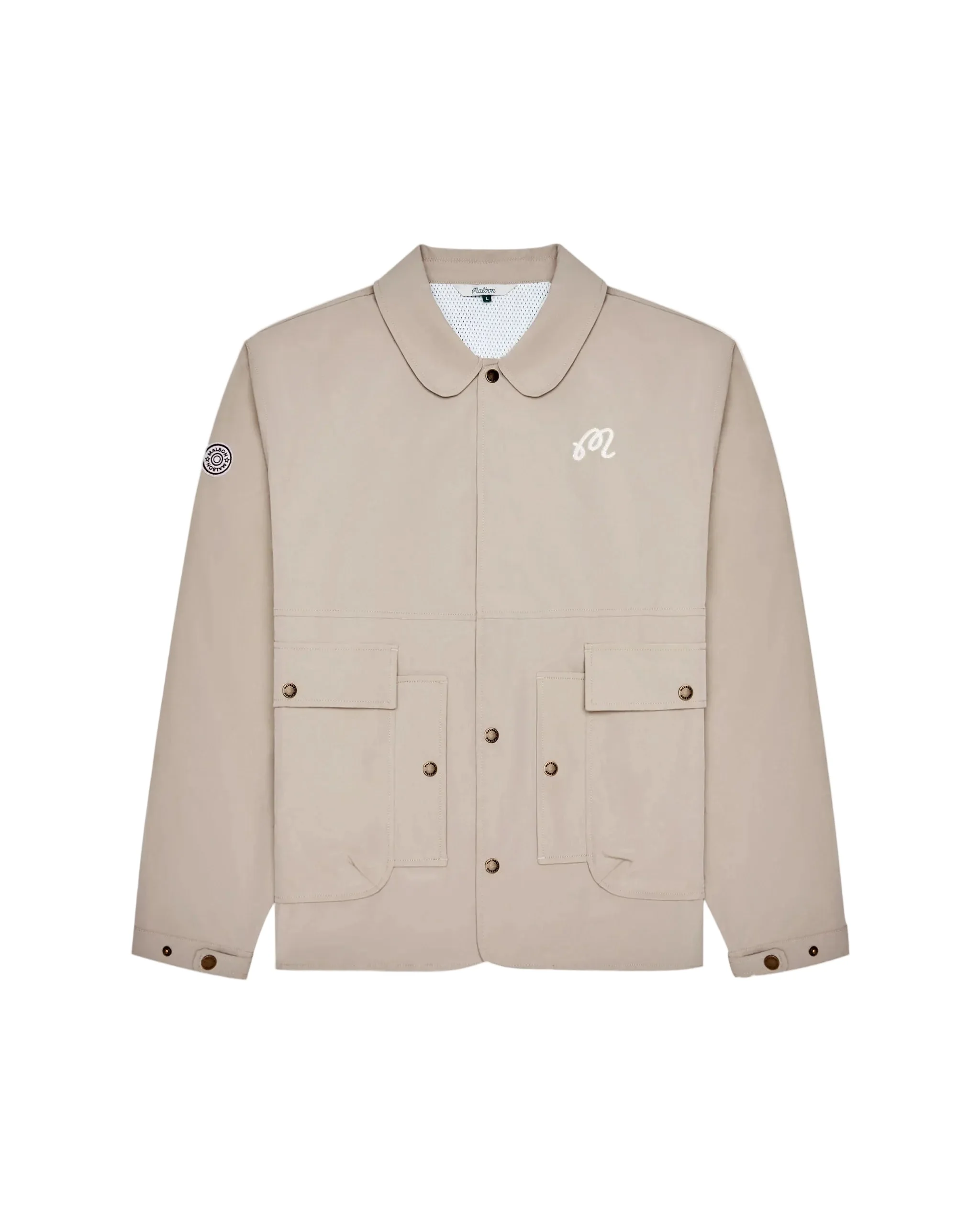 Brigands Shacket in khaki by Malbon. A versatile shacket designed for layering. Features a concealed snap button placket, functional front pockets with side access, and adjustable button cuffs. Made from 100% polyester with a relaxed fit. Includes metal d-ring detail and embroidered branding.