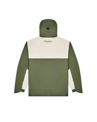 Cloud Burst Foraging Rain Jacket in olive nylon with a relaxed fit. Features side pockets, adjustable drawcord waist and hood with lock stoppers, and contrast piping. Printed M script logo on chest and Malbon branding on back. Reliable weather protection.