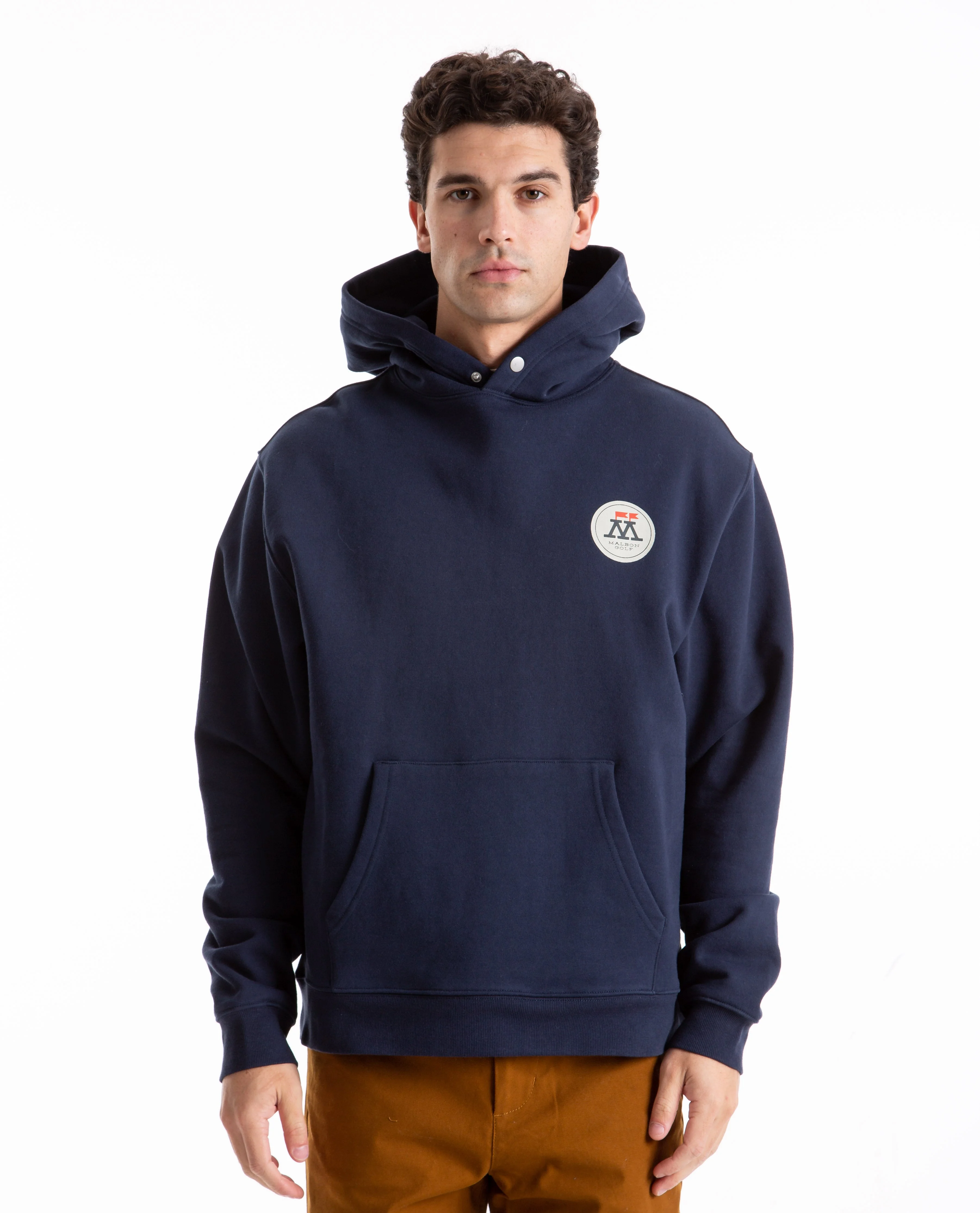 Flag Seekers Hooded Sweatshirt in indigo by Malbon. Featuring a garment wash for a soft feel and a metal snap button fastener closure for added convenience. The Malbon Golf Flag logo is screen-printed on the left chest and back. Stay warm and comfortable with ribbed hem and cuffs. Store ID: C-M-8281-IDG Model is wearing size: M Model is: 5'11", Chest 42", Waist 32" 100% Cotton Wash Cold Imported