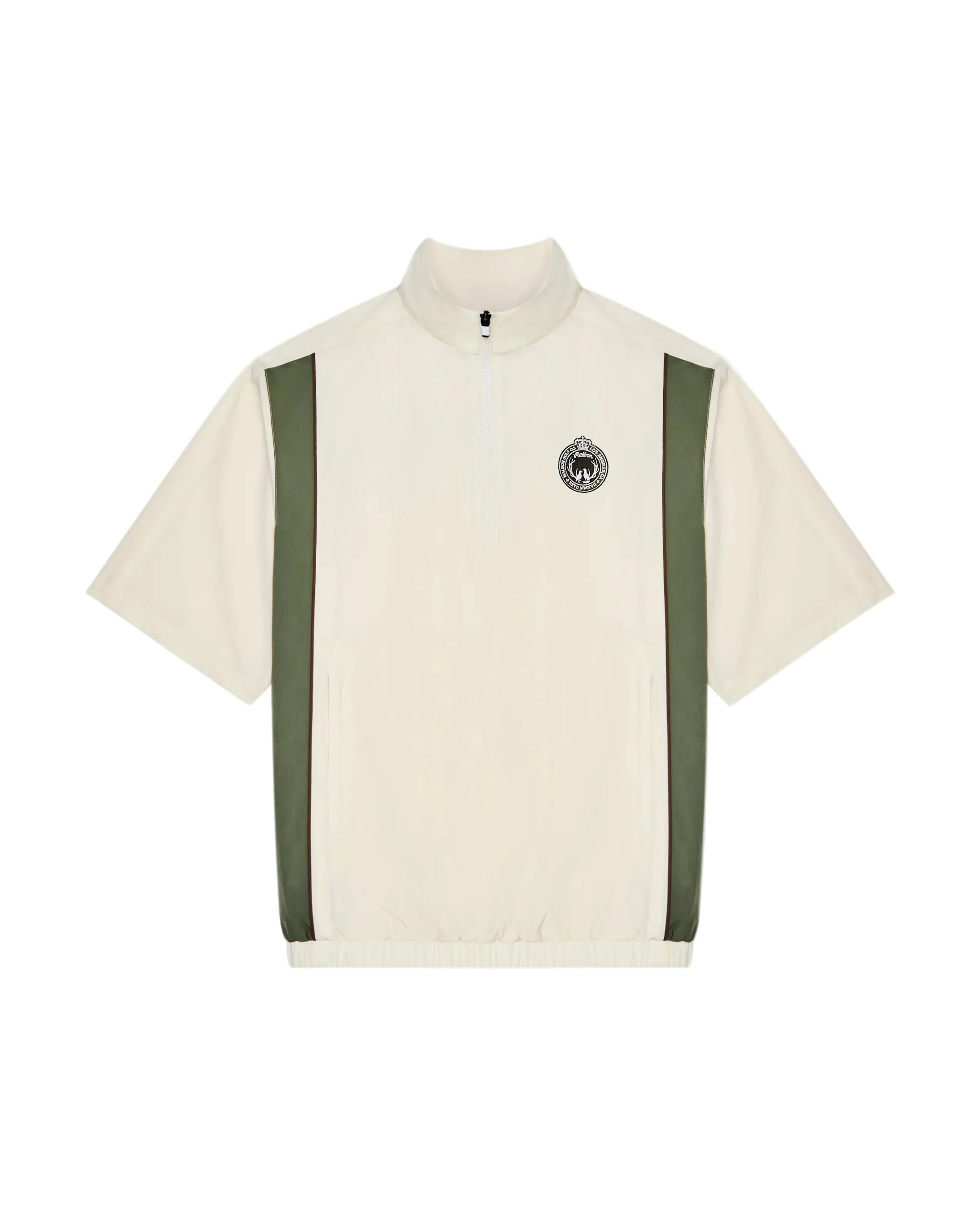 Beige Links Oakwood Windshirt by Malbon featuring a quarter-zip stand collar, contrast piping, zip and side pockets, elastic waist, Malbon Golf patch on the left chest, and printed Malbon script logo on the back. Relaxed fit. 88% nylon 12% elastane