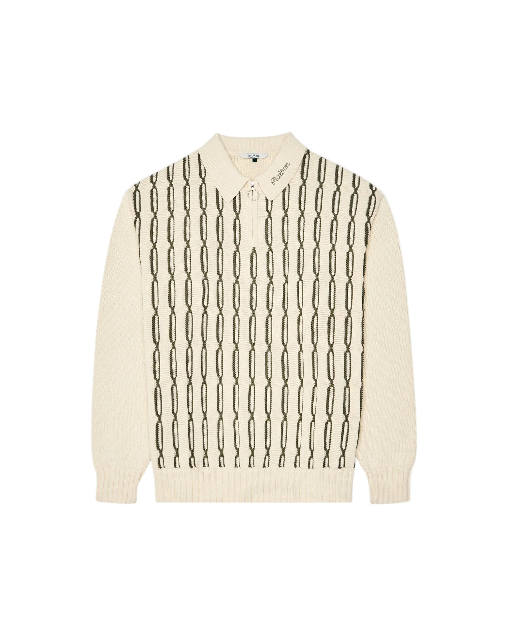 The Links Polo Sweater by Malbon in beige features a quarter-zip, ribbed trim, and a repeating intarsia links pattern. Made from 98.8% cotton and 1.2% nylon, it offers a relaxed fit with ribbed cuffs and waist, plus an embroidered Malbon script logo on the collar.