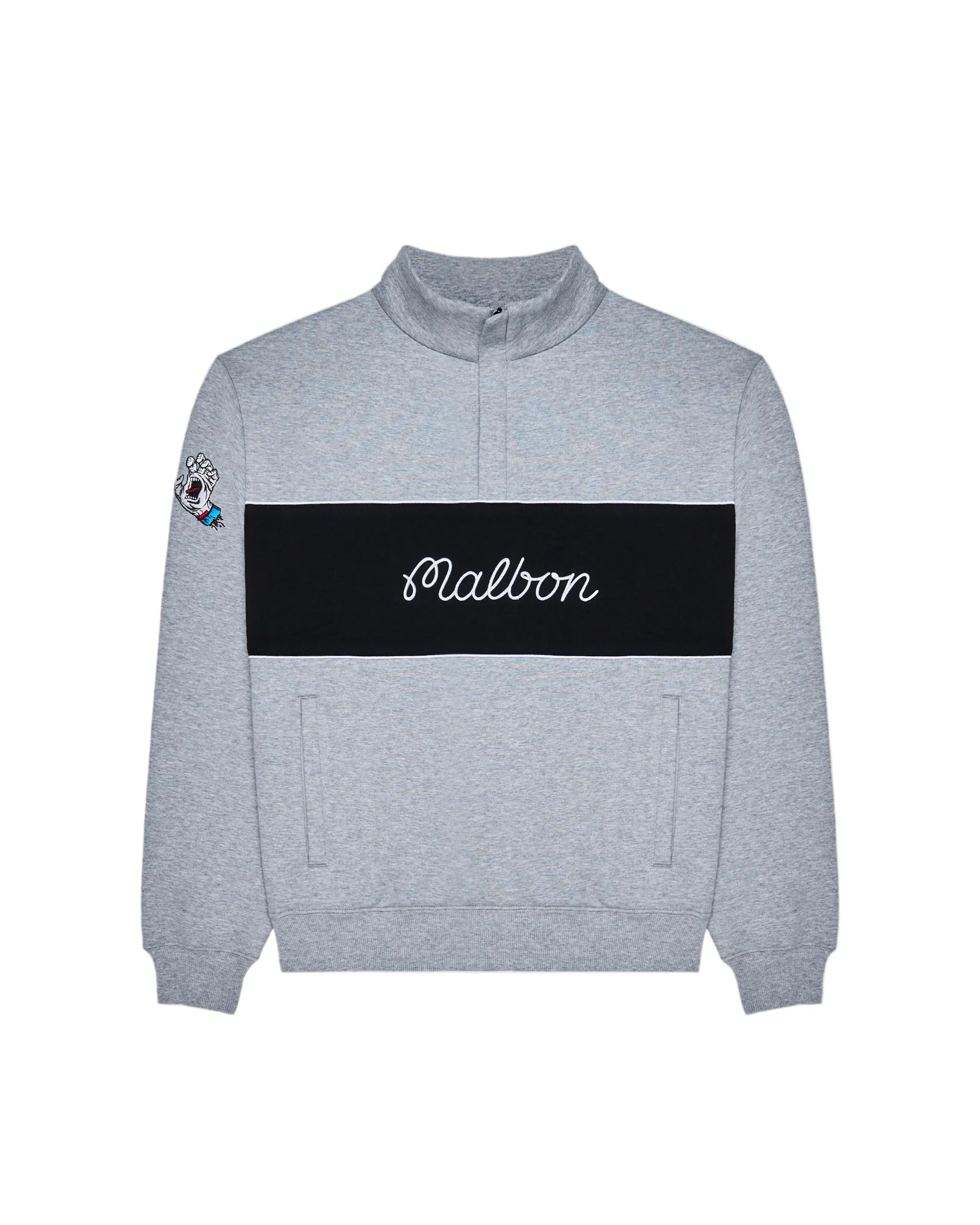 The Santa Cruz Sweatshirt in heather grey by Malbon is a lightweight, breathable pullover made from 100% cotton. It offers a relaxed fit, ribbed cuffs and waistband, front pockets for secure storage, and a stand collar for added warmth. Features include an embroidered Screaming Hands graphic on the right sleeve, an embroidered Malbon script logo on the front, and a printed Santa Cruz Skateboards logo on the back.