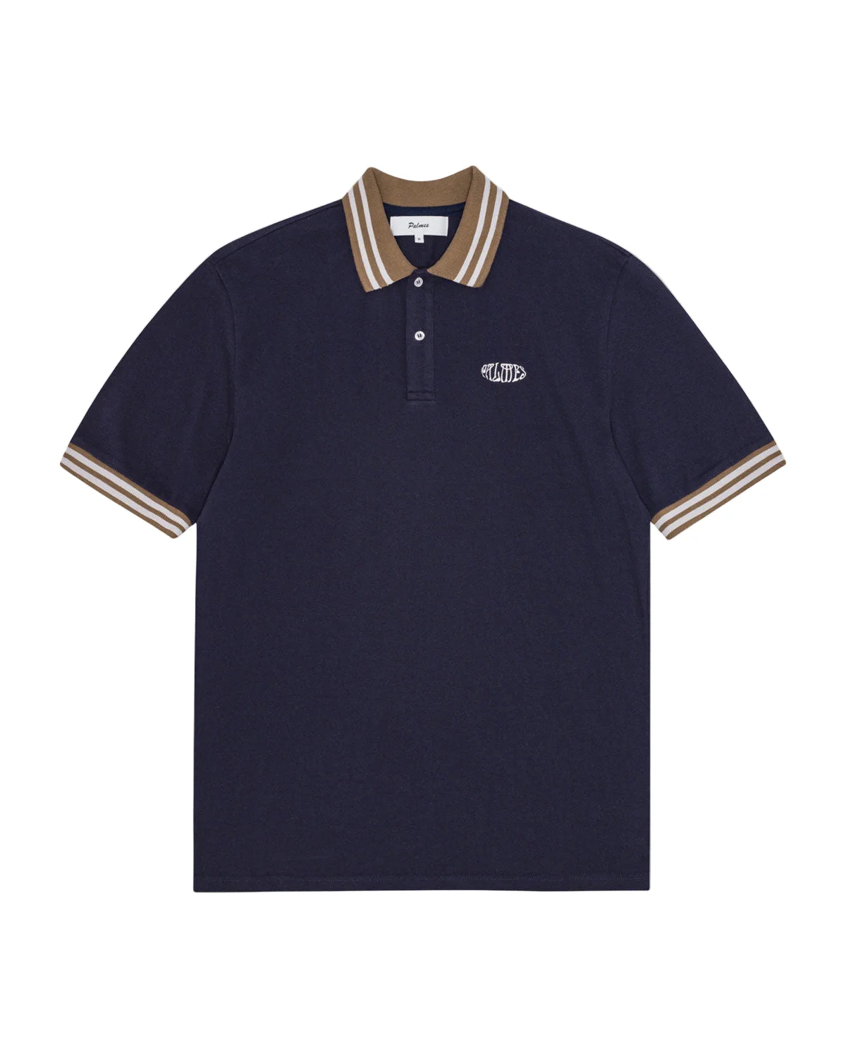 The Oval Pique Polo by Palmes features navy blue 210gsm cotton pique fabric, complemented by a contrasting collar and striped accents. It also includes embroidery on the left chest. Made in Portugal