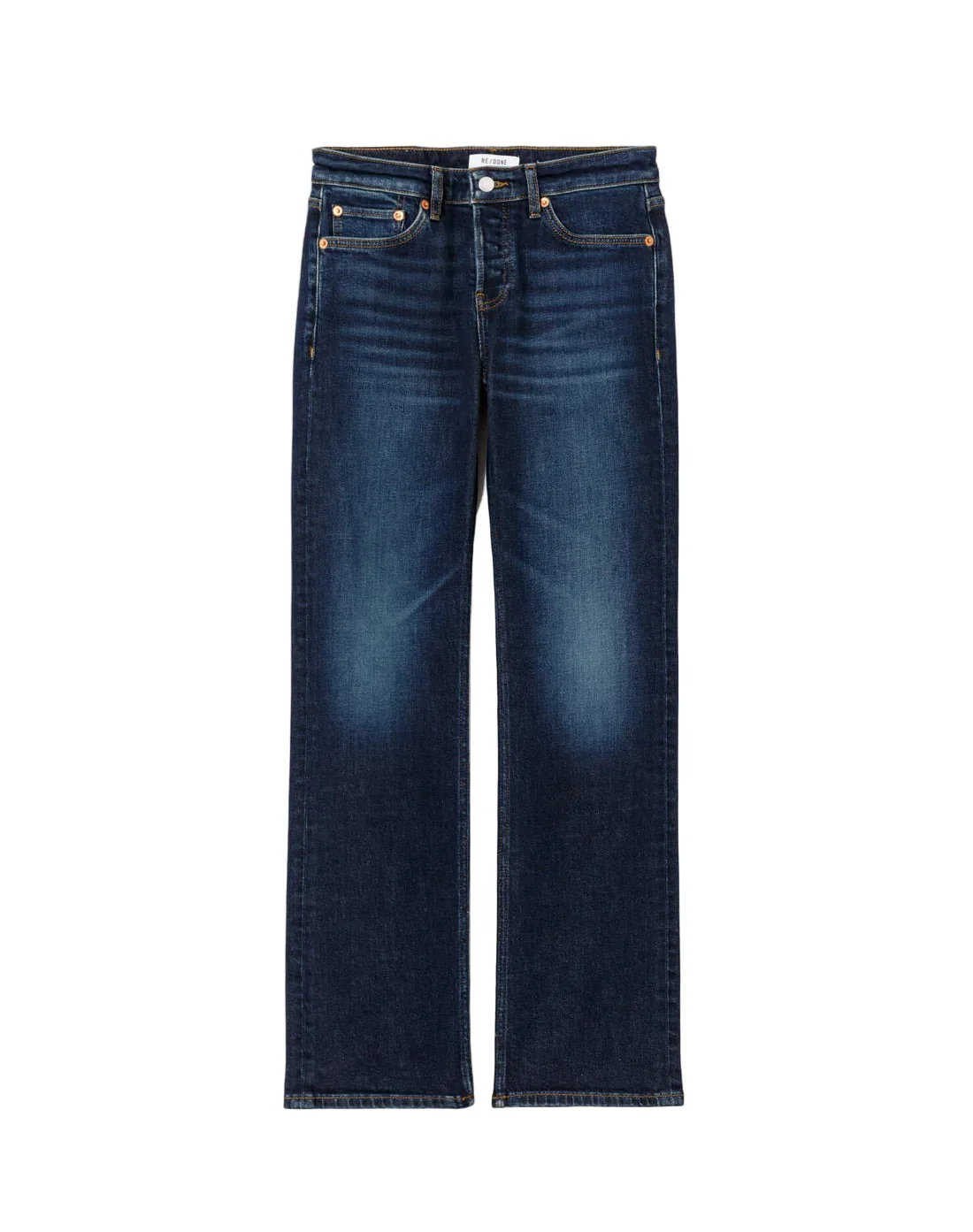 70s Bootcut jeans in Barely Worn indigo wash. Features button fly, belt loops, five pockets, and RE/DONE logo patch. Outer: Cotton 96%, Polyester 3%, Elastane 1% Lining: Polyester 65%, Cotton 35%