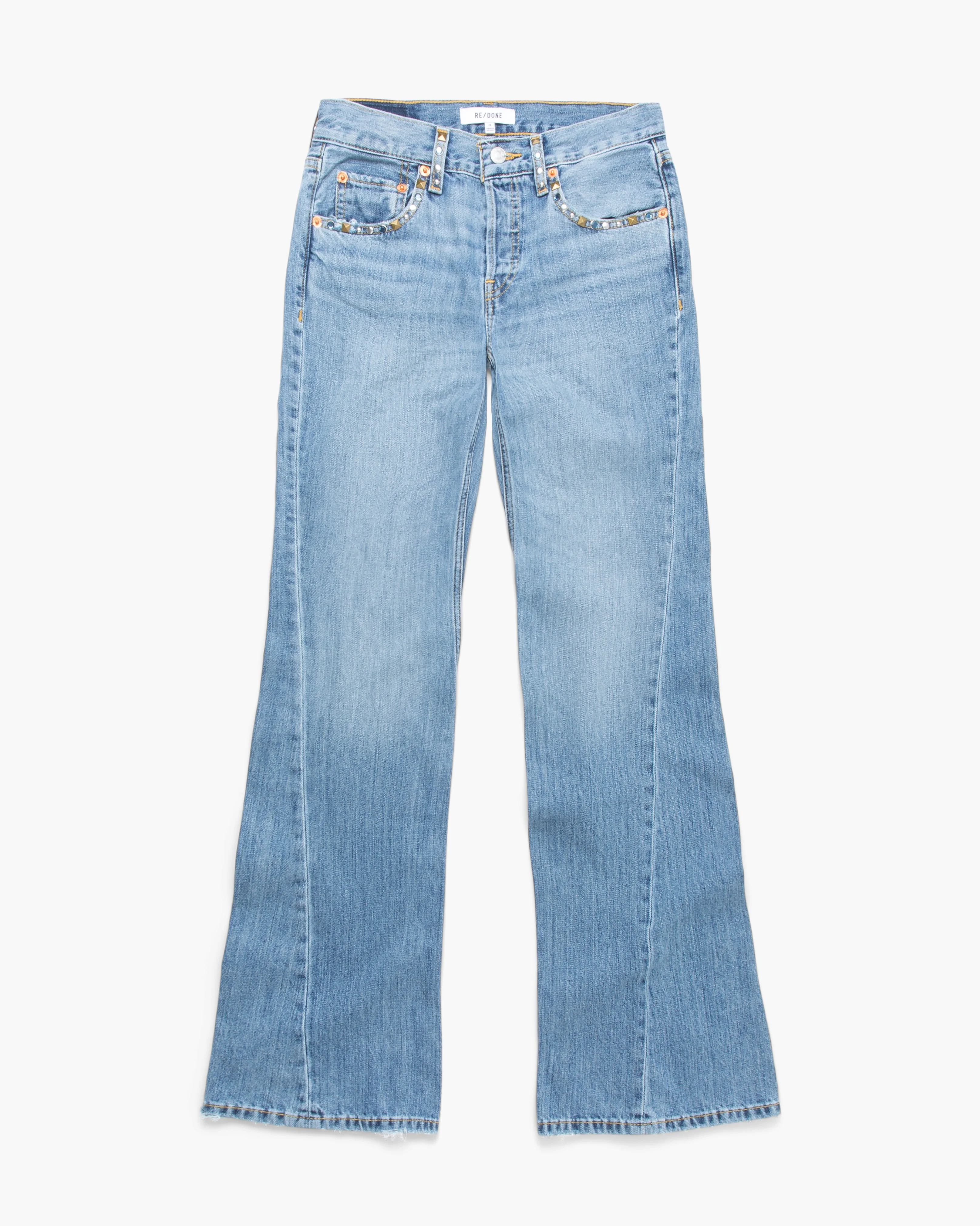 Twisted Mid Rise Bootcut in Thunderstruck by RE/DONE.Mid-rise bootcut with twisted seams and a 5-year worn wash on rigid, all-season denim. Detailed with mixed metal studs, classic button fly, and finished hem for an authentic vintage aesthetic.