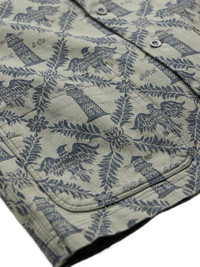 The Jacquard Camp Shirt by RRL in indigo showcases an eagle and lighthouse pattern, with front button closure, short sleeves, chest patch pocket, and two additional front patch pockets. Made from 100% cotton.