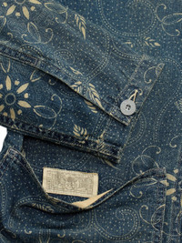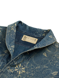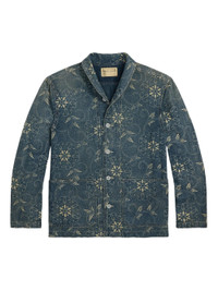 The Printed Wilson Overshirt in indigo by RRL features a floral pattern, front patch pockets, buttoned cuffs, and tonal stitching. 100% Cotton Imported