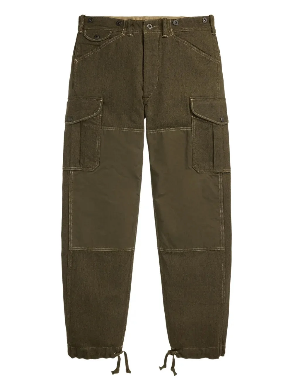 These olive Regiment Fit Cargo Pants by RRL are made from a wool-cotton Japanese twill with waxed canvas reinforcements. They feature a regular fit, straight leg, button fly, and drawstring hems. Pockets include angled front, coin, cargo, and snapped back pockets, all with waxed canvas details for durability. Shell: 45% wool, 37% cotton, 14% polyester, 4% other fibers. Panels: 100% cotton.