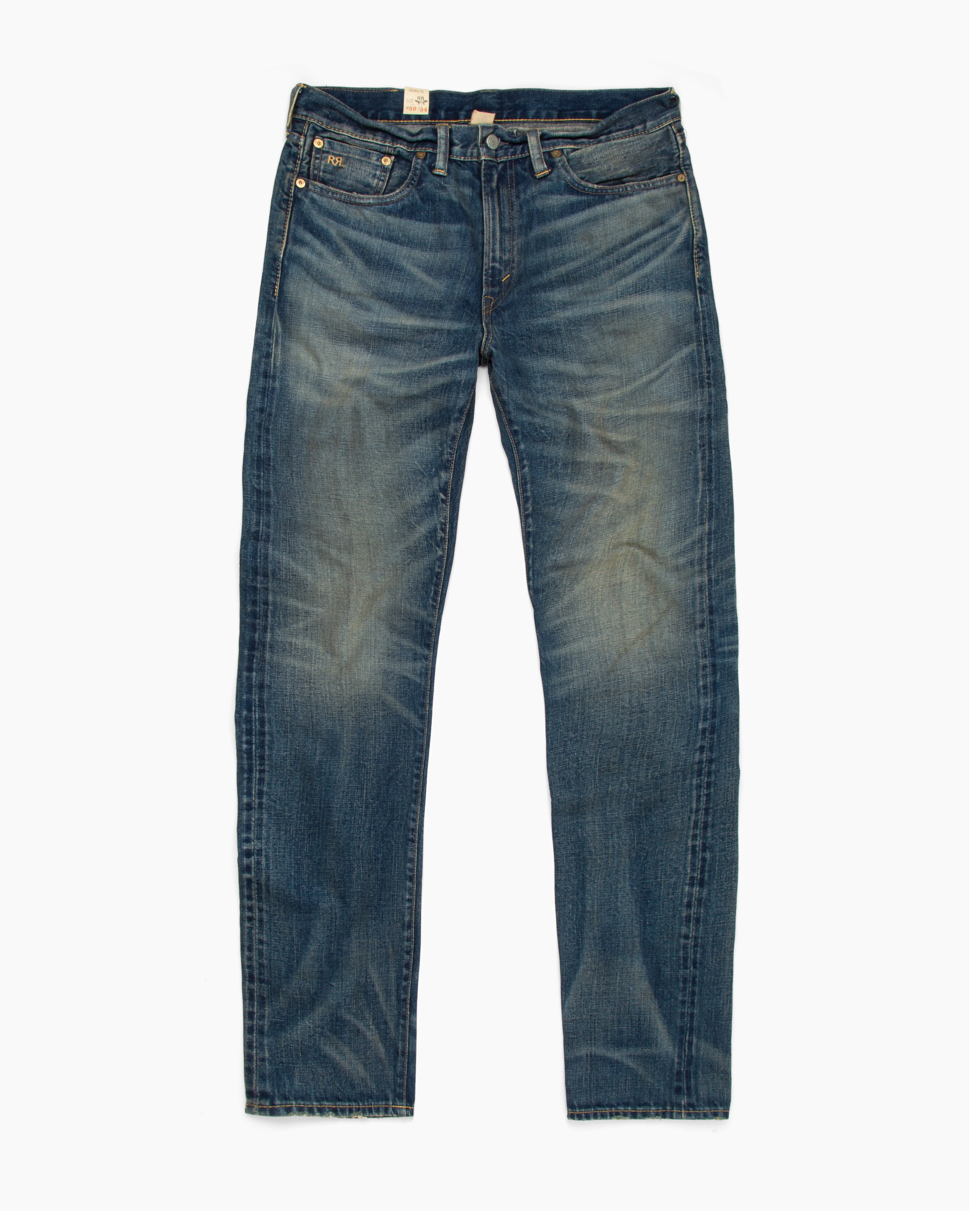 The Slim Fit Selvedge Jean in Yosemite wash from RRL features stonewashed denim, a logo patch on the rear belt loops, a low-rise slim silhouette, front button closure, and classic five-pocket styling. 100% Cotton