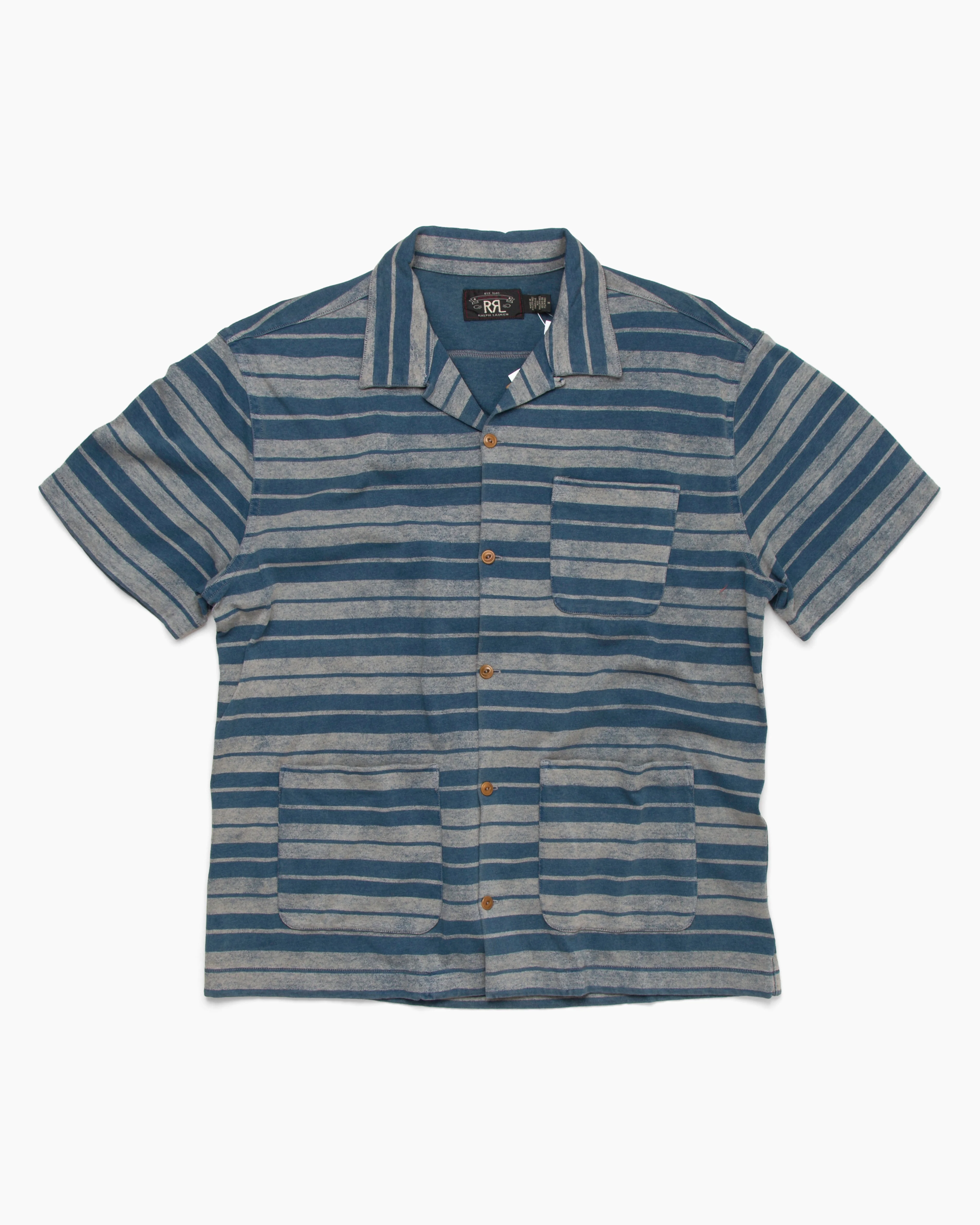 The Striped Jersey Camp Shirt in indigo by RRL is crafted from cotton jersey dyed with true indigo. It features discharge-printed horizontal stripes inspired by a vintage swatch and is finished with Corozo buttons.