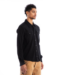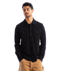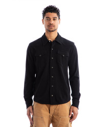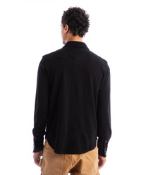 Wool-Cashmere Western Shirt Sweater in black by RRL. Crafted with a blend of soft, luxurious wool and cashmere, this Western-style shirt sweater features a straight collar and metal button at the front. The snapped placket and barrel cuffs add a touch of modern edge while the twill reinforcements provide durability. Two chest pockets offer convenience. Store ID: 782942991001 Model is wearing size: M Model is: 6'1", Chest 40", Waist 30" Shell: 90% wool, 10% cashmere. Reinforcements: 51% cupro, 49% cotton. Hand wash or dry clean Imported